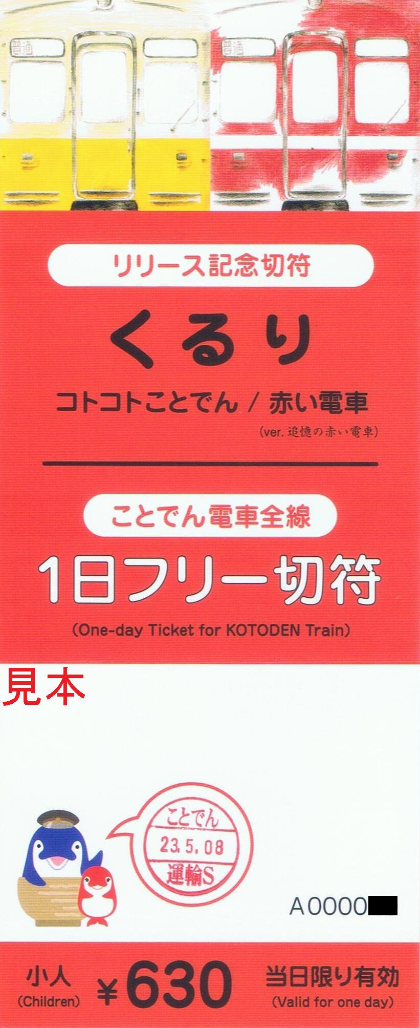 くるりのニュー・シングル『コトコトことでん / 赤い電車 (ver. 追憶の赤い電車)』のリリースを記念して発売された記念乗車券で、写真左は小人用、右は大人用です。当時、高松琴平電気鉄道では京浜急行電鉄時代のリバイバル塗装『還暦の赤い電車』を運行していました。【関連記事】
