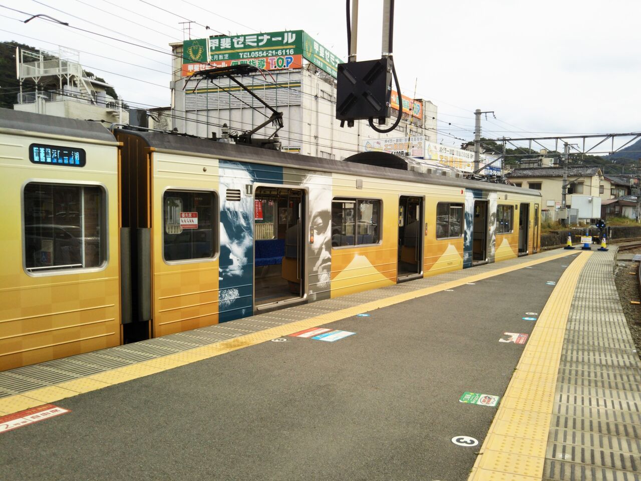 山梨リニア実験線試乗の帰りに田野倉駅から乗車した普通列車・大月行は「玉置浩二×オーケストラ 河口湖ステラシアター公演」 特別ラッピング列車でした。オリジナルのヘッドマークを装着していました。