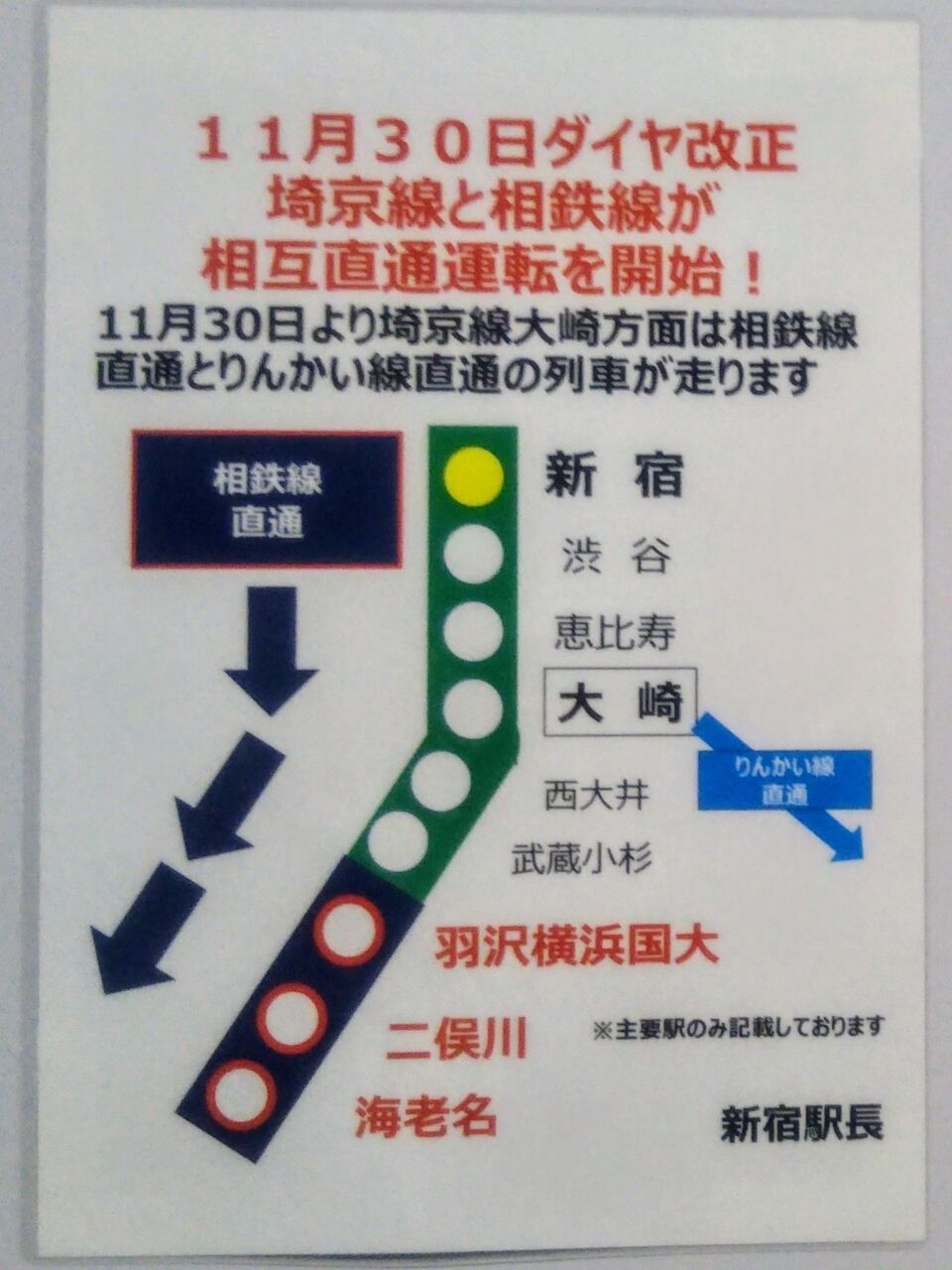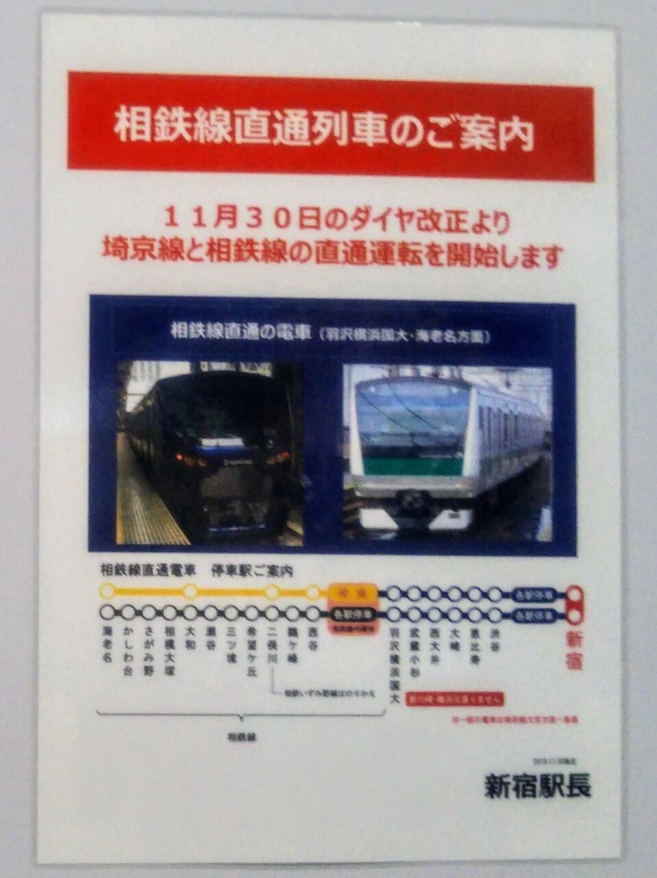 ¡¡Æ±¤¸¤¯1Ž¥2ÈÖÀþ¥Û¡¼¥à¤Ë·Ç¼¨¤µ¤ì¤Æ¤¤¤¿¿·½É±ØÄ¹¤Î¥Ý¥¹¥¿¡¼¤Ë¤Ï¡ØÁêÅ´ÀþľÄÌÎó¼Ö¡Ù¡ØÁêÅ´ÀþľÄÌÅż֡١ØÁêÅ´ÀþľÄ̡٤ÈÍÍ¡¹¤Êɽµ¡£JRÀþÆâ¤ÏÅÓÃæ¡¢½Âë¡¢·ÃÈæ¼÷¡¢Âçºê¡¢À¾Âç°æ¡¢É𢾮¿ù¤ËÄä¼Ö¡£