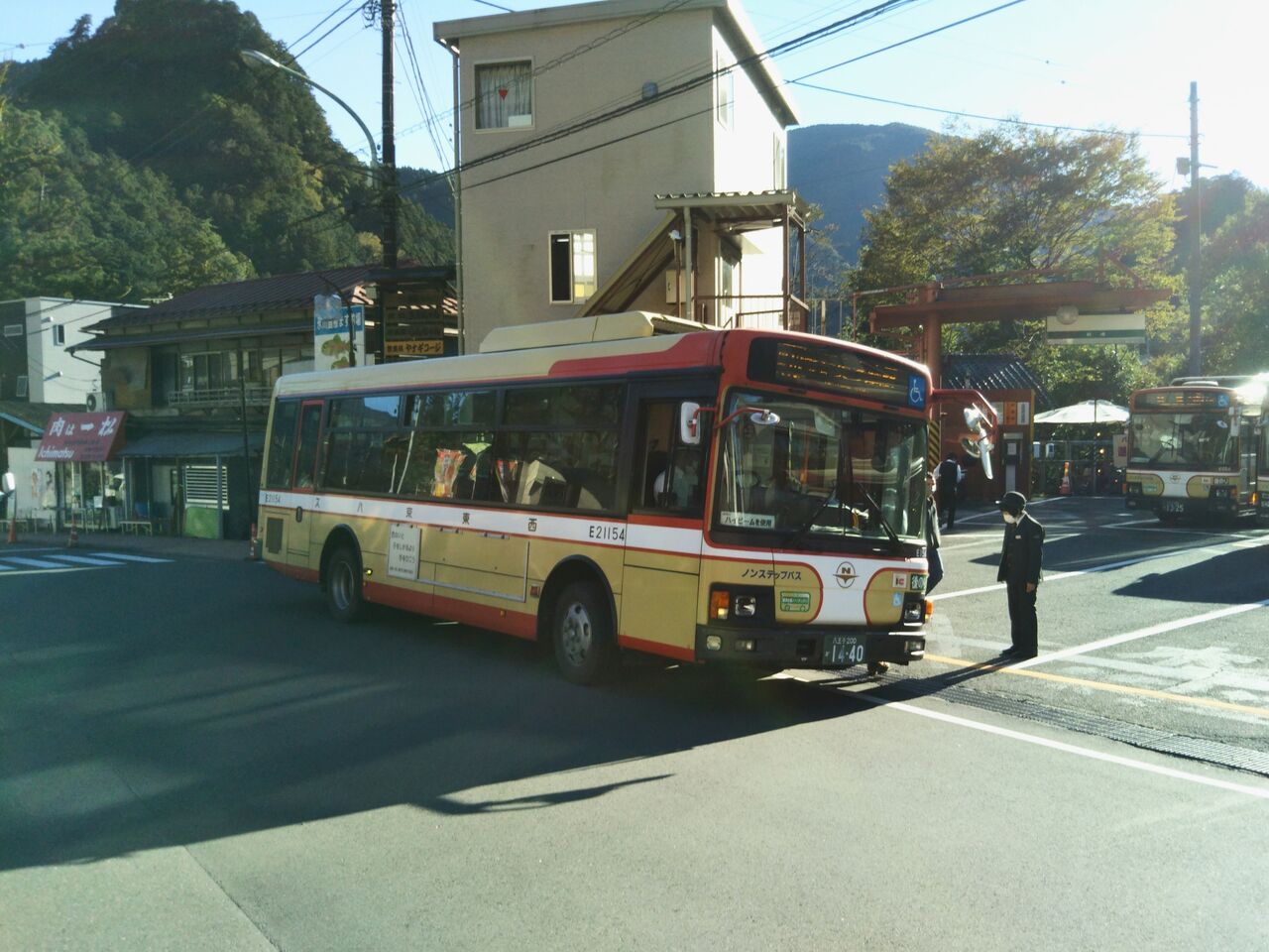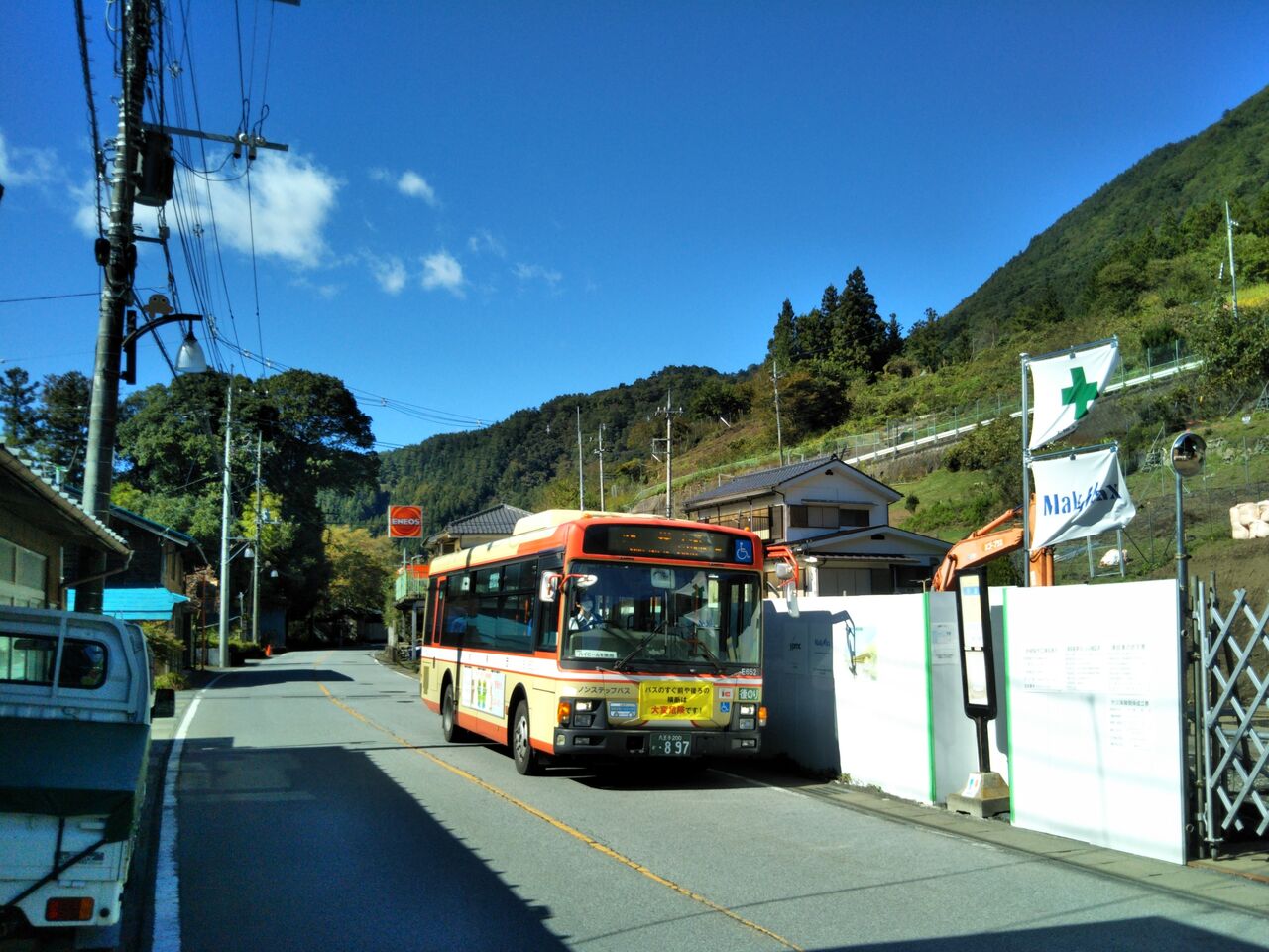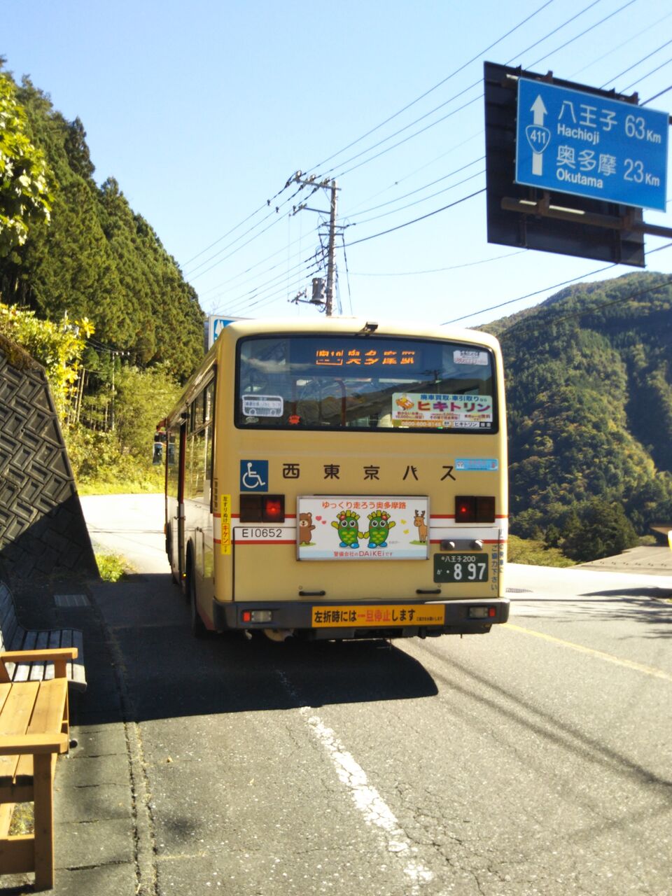 丹波行バスに乗車。先述の通り奥多摩湖行の増発便を先行して発車させ、丹波行は11:03に発車しました。乗客は21名。水根までの途中の停留所で地元住民が2名、小河内神社で10名、鴨沢で6名下車。私を含む残り3名はプレミアム車内アナウンス目的のマニアでした。