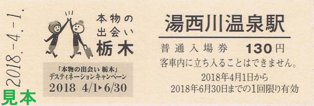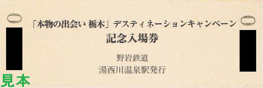 栃木県内の鉄道事業者5社(JR東日本、東武鉄道、真岡鐵道、わたらせ渓谷鐵道、野岩鉄道)で発売したDCを記念したD型硬券入場券です。野岩鉄道版は湯西川温泉駅の入場券で、1枚130円でした。