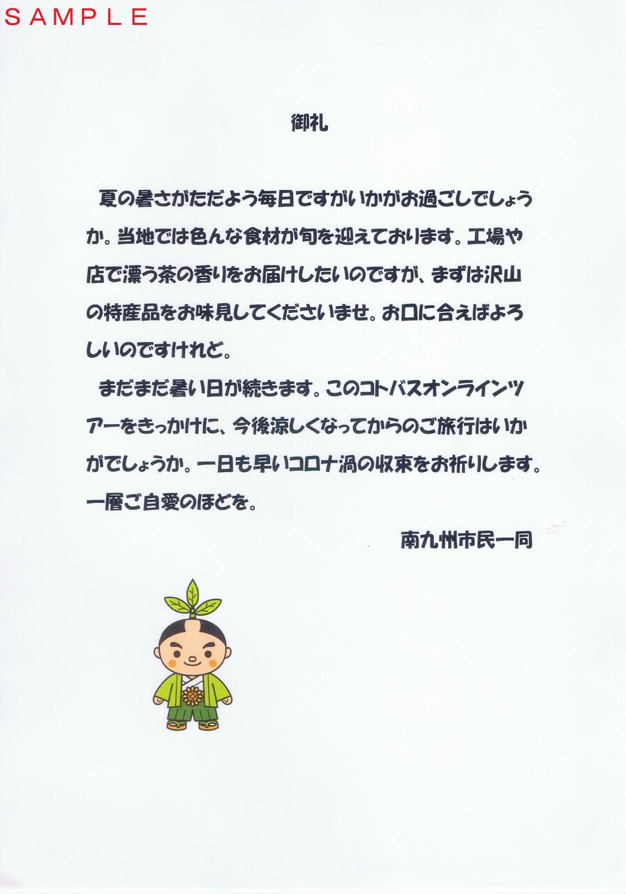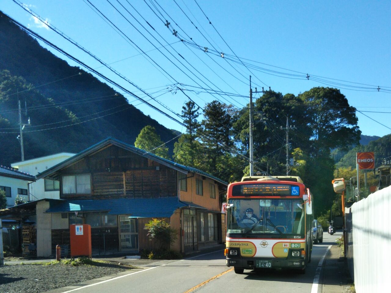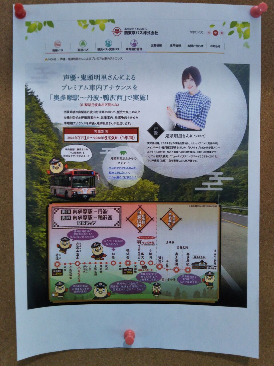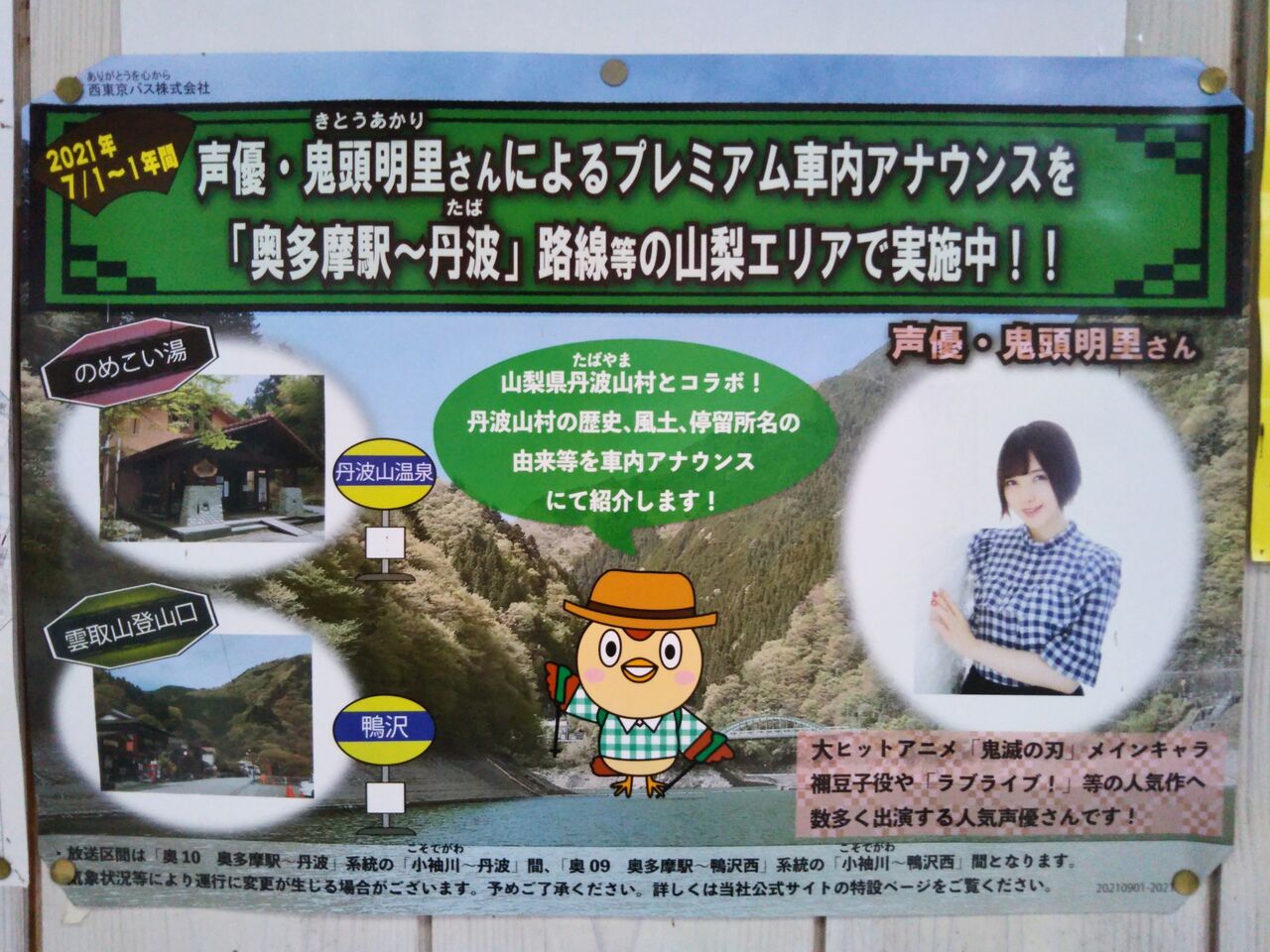 沿線の丹波山村がアニメ『鬼滅の刃』の主人公・竈門炭治郎とその妹・禰豆子の出身地・雲取山の登山口であり、聖地巡礼で活気づいていました。丹波山村では丹波線での鬼滅の刃ラッピングバスの運行を考えていましたが、財政上の理由で実現しませんでした。代わりに禰豆子役の声優・鬼頭明里さんを起用し、丹波線・鴨沢西線の丹波山村内の区間(小袖川〜鴨沢西〜丹波間)にて『プレミアム車内アナウンス』を2021年(令和3年)7月1日から1年間実施。車内の停留所名案内表示も特別デザインとなっていました。