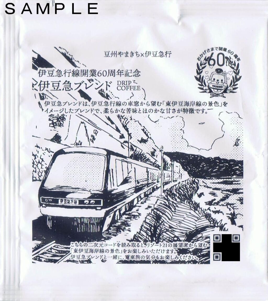 伊豆急行線の開業60周年を記念して発売されたドリップコーヒーで税込150円。販売者は株式会社伊豆急コミュニティー観光事業部(伊豆急物産)。製造所は株式会社ピーエスアイで、琴平バスのオンラインバスツアーで提供されているドリップコーヒーの製造も行っています。