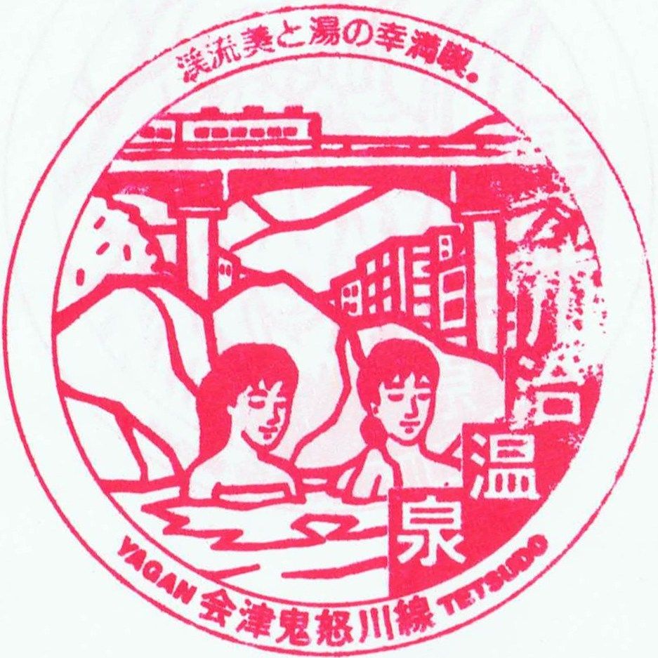 新藤原駅で記帳されていた初期の鉄印で、やがぴぃのデザイン。記帳料は税込300円。このバージョンのみ駅員による鉄印帳への貼り付けと割印の押印がされており、発行に時間が掛かっていました。