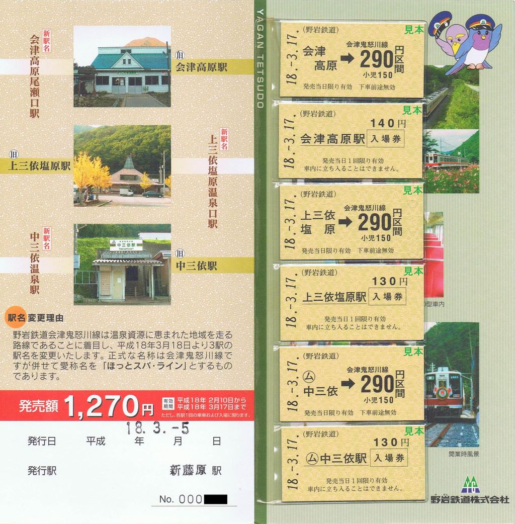 会津高原駅、上三依塩原駅、中三依駅の駅名改称記念。A型硬券乗車券3枚+入場券3枚+台紙のセットで発売。