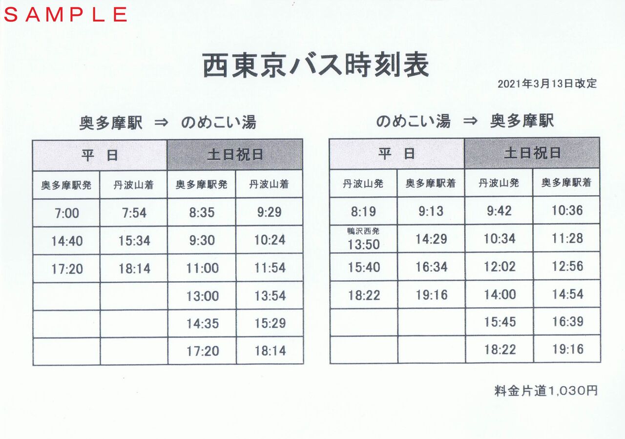 《道の駅たばやま・のめこいの湯 西東京バス時刻表 2021年3月13日改正》