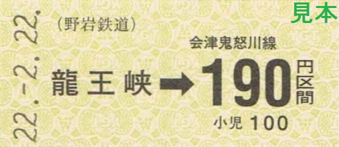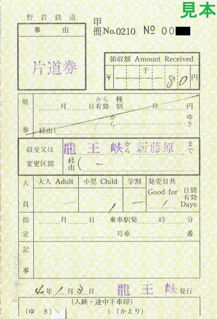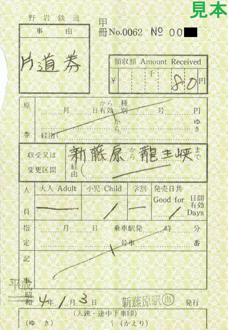 訪問日の時点で既に下記の各駅にしか硬券が残っていませんでした。下の2種類の券は龍王峡、会津高原各駅の最安の硬券乗車券でした。これらの券種より高額の券が存在したかは分かりません。
