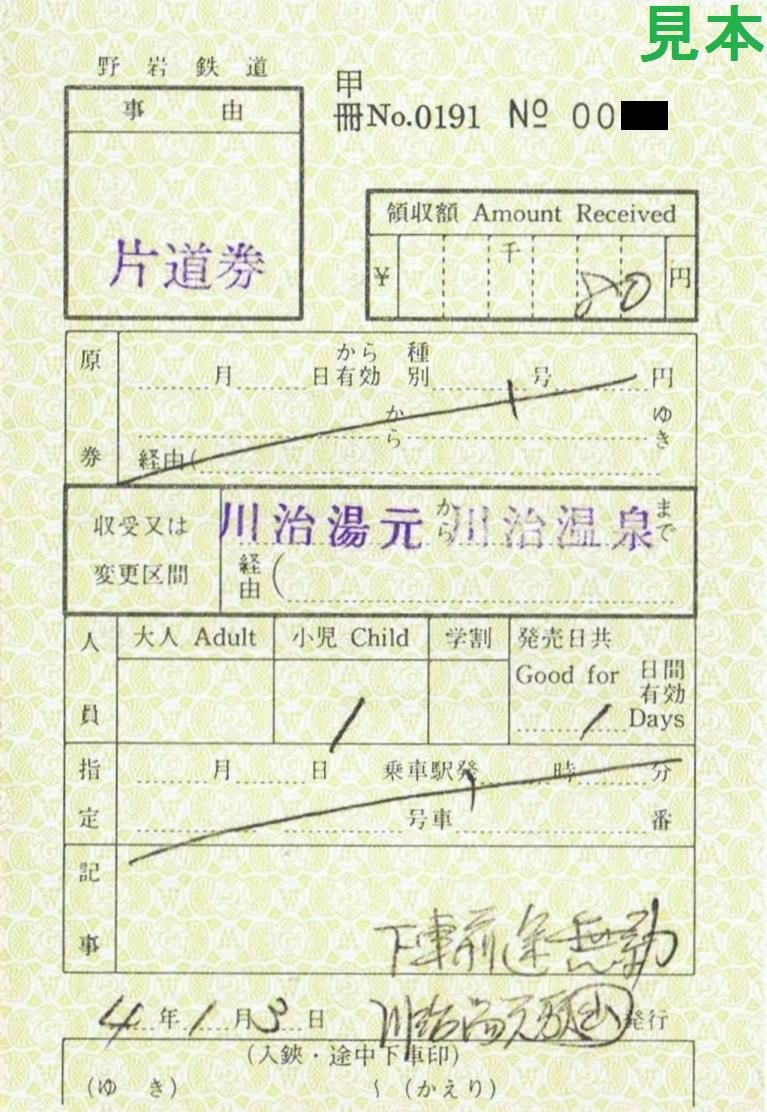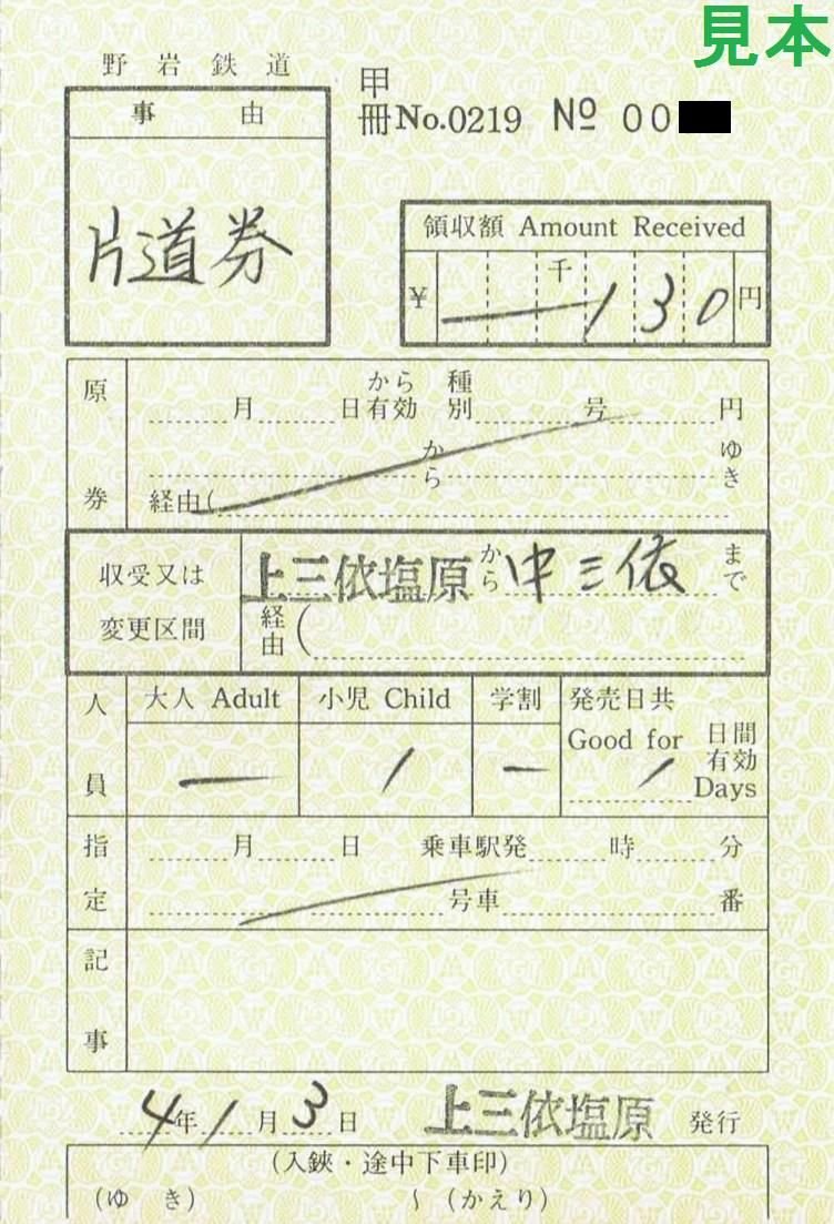 会津高原駅で購入したものです。同駅には券売機があり、それ以外の切符は無いか尋ねたところ、この券が出てきました。中三依、下野上三依、会津高原の各駅は改称されており、特に下野上三依駅については後に上三依塩原駅→上三依塩原温泉口駅と2度も改称されています。『(○囲み)臨』はおそらく臨時という意味でしょう。当時、この券がいつでも買えたのかは分かりません。残念なのが当時の硬券や車補の有無を聞いていなかった事ですが、小学生の頃に入手したものにしては随分良い状態で残っていたと思います。