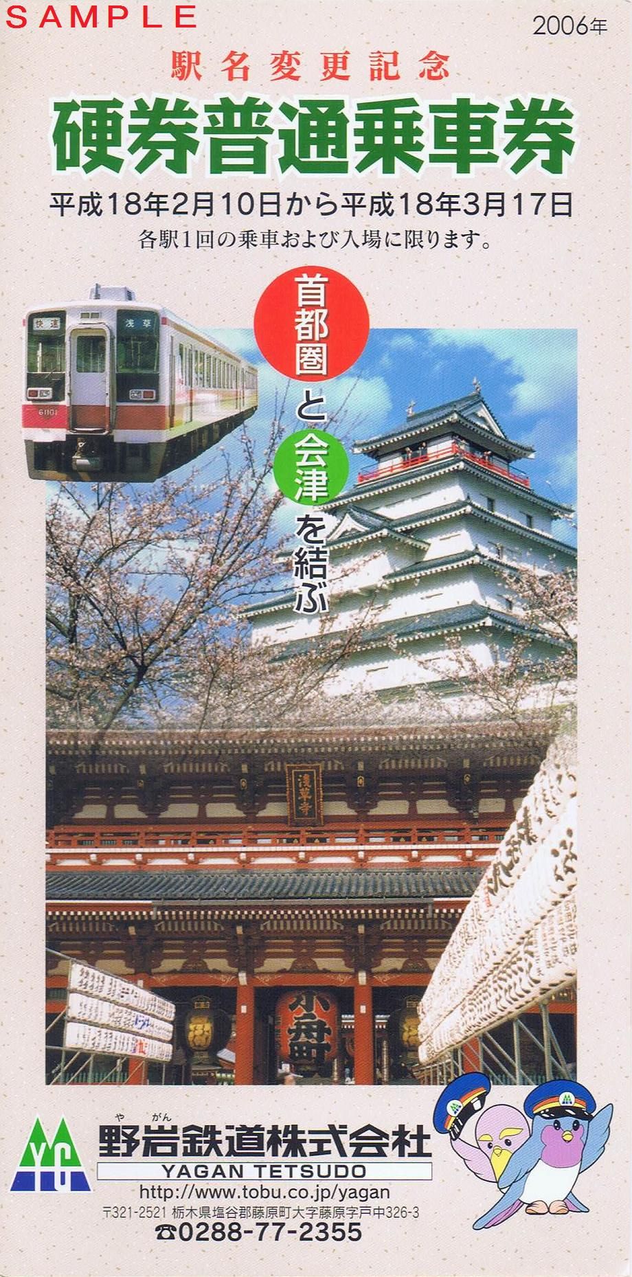 野岩鉄道有人駅と野岩鉄道所属の車掌が担当する列車内で発売。社章やイラスト、柄がたくさん入っていますが地紋が鮮明で良い感じです。〔史跡めぐり往復割引きっぷ〕