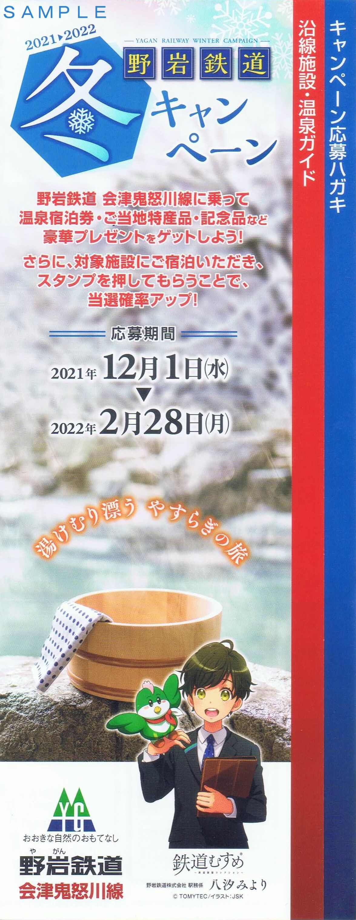 野岩鉄道利用促進協議会が2021年(令和3年)12月1日から2022年(令和4年)2月28日に実施しているキャンペーンのパンフレットで、野岩鉄道の駅や東武鉄道鬼怒川温泉駅で配布されていました。表紙にはやがぴぃ、鉄道むすめ・八汐みよりのイラストが使用されています。