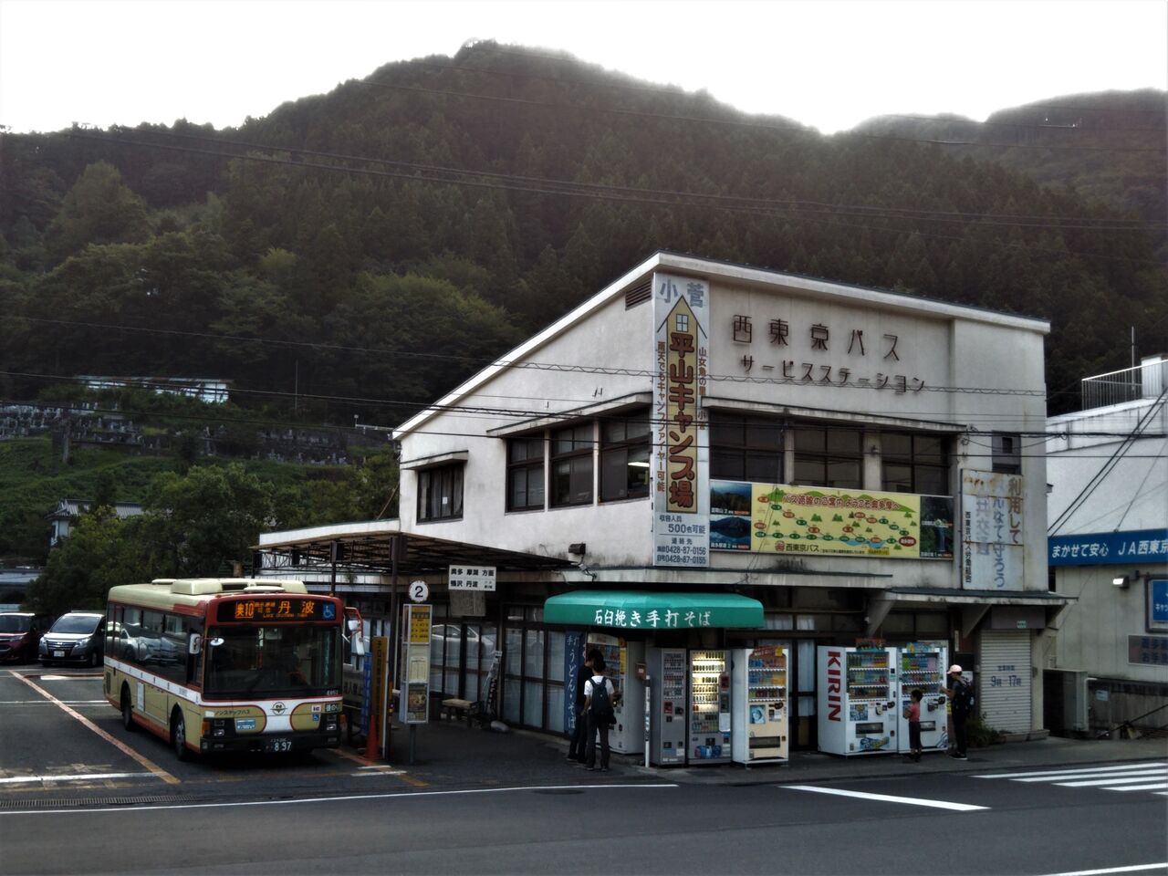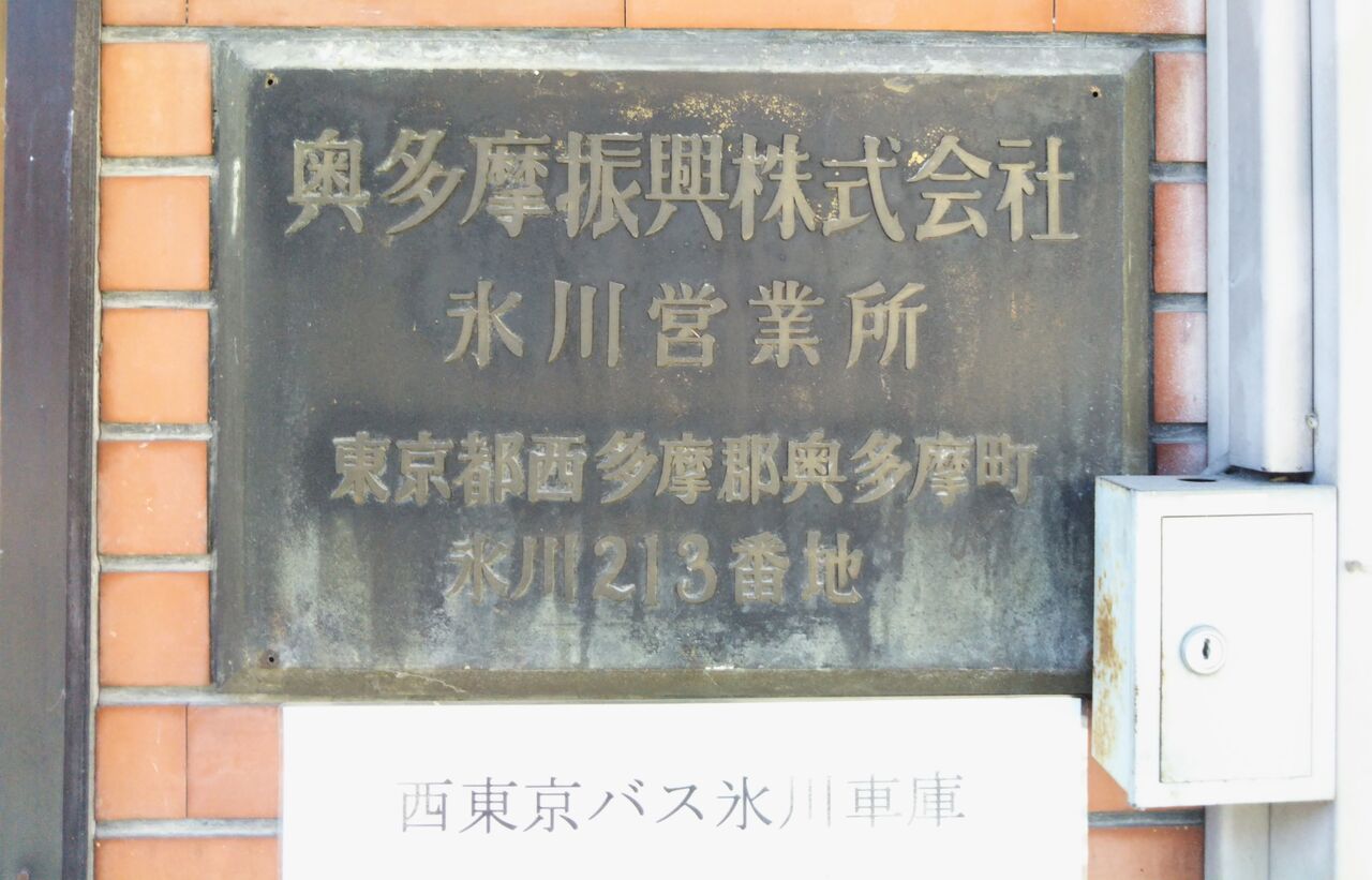 サービスステーション建物の右側入口横には旧社名である奥多摩振興時代の看板があります。