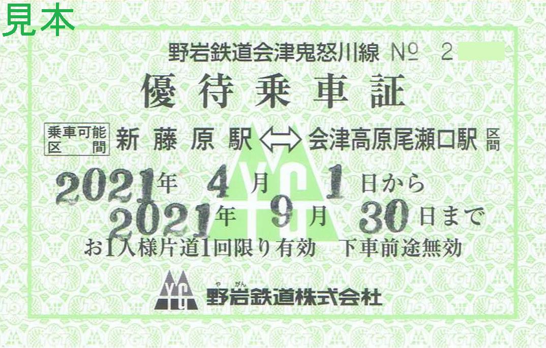 野岩鉄道利用促進協議会が2020年(令和2年)12月5日から2021年(令和3年)3月5日に実施していた『野岩鉄道冬キャンペーン』の賞品(ペア宿泊券:2組、ご当地特産品:20名、記念品:120名)のうち、記念品の当選者30名に2枚プレゼントされた優待乗車証です。有効期間は2021年4月から半年で、日付がスタンプで押されています。