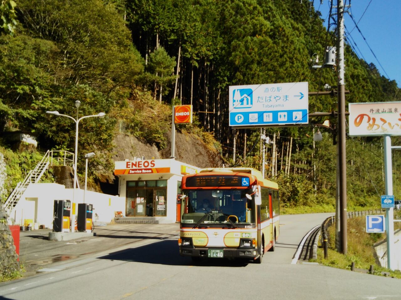 写真右は道の駅たばやまの看板と丹波行のバス。