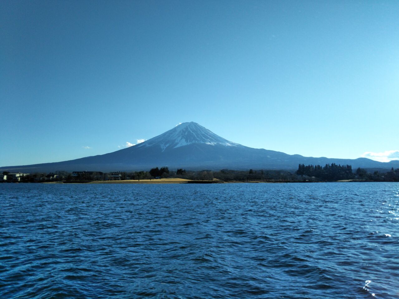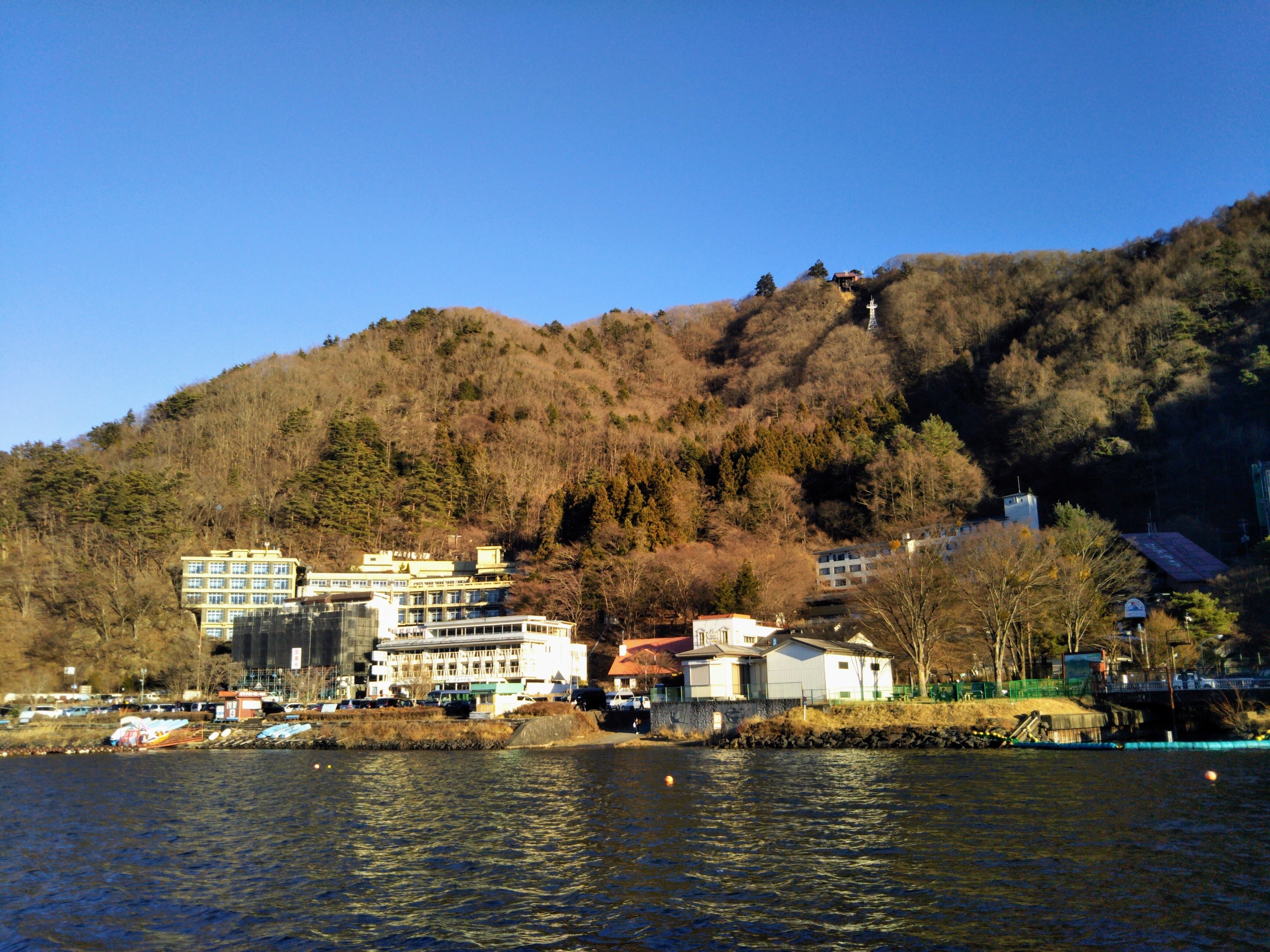 遊覧船乗り場付近の船上から乗り場、〜河口湖〜富士山パノラマロープウェイ方向を撮影。