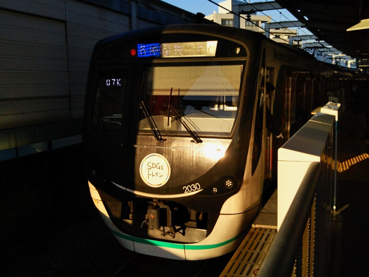 田園都市線のSDGsトレインは2020系を使用。各停・押上行。写真右はヘッドマークです。