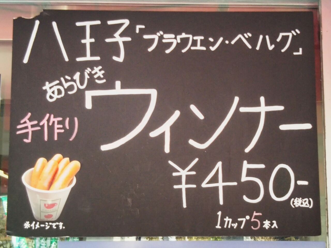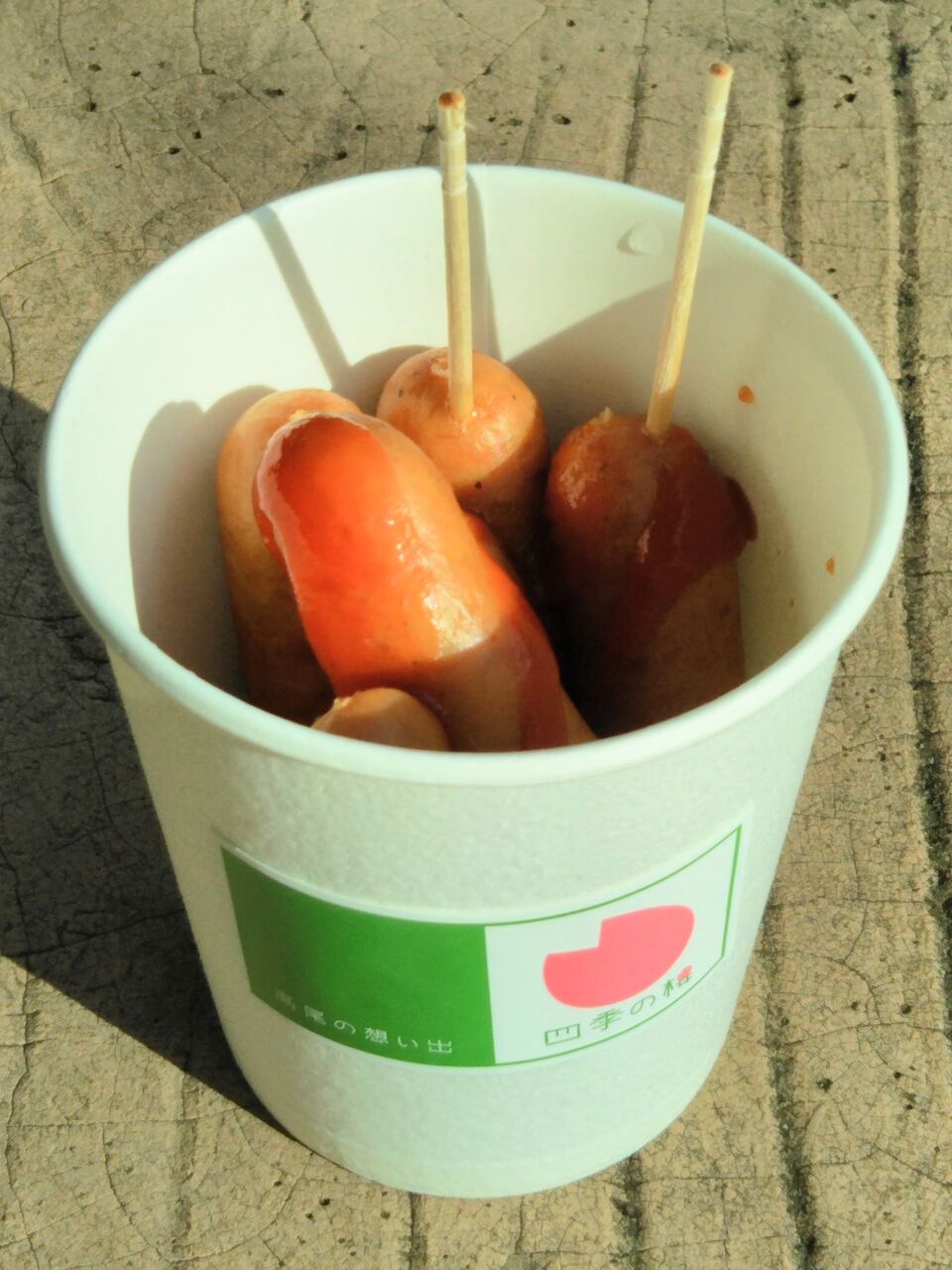 後に軽食も扱う様になりました。テイクアウトメニューのひとつが八王子ブラウエン・ベルグのあらびきウインナーで税込450円。カップに入って食べやすくなっています。そば以外の食事の選択肢も出来て最高です。