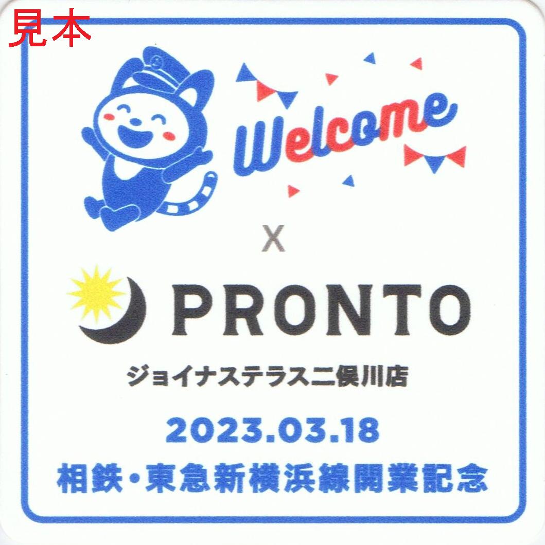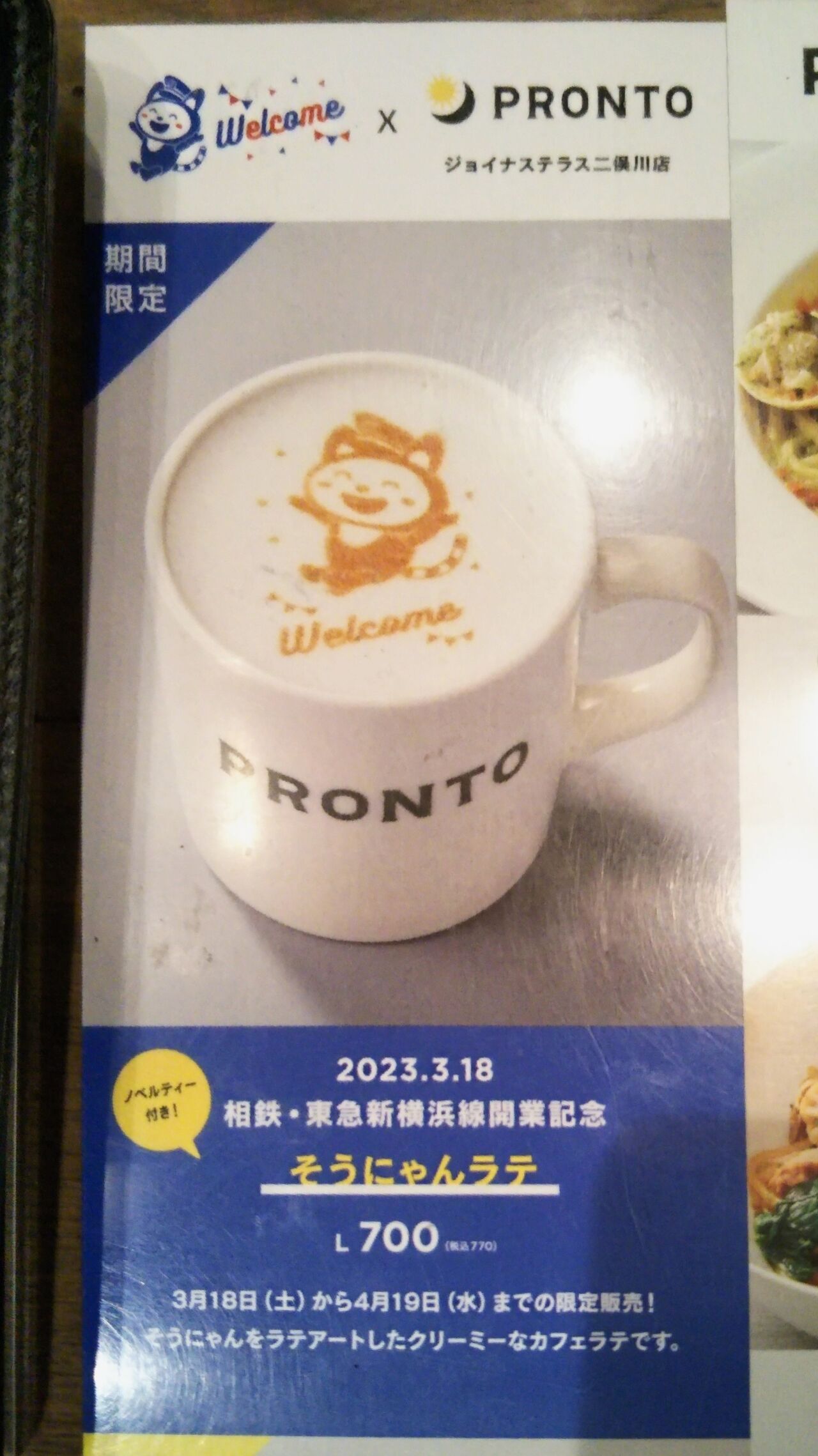 二俣川駅商業施設『ジョイナステラス二俣川』では相鉄・東急新横浜線の開業を記念した『ウェルカムフェア』を開催しており、一部店舗では相模鉄道キャラクター・そうにゃんコラボ商品を期間限定発売しています。『PRONTO(プロント)』では税込770円にて『そうにゃんラテ』を発売しており、先着500名に写真のコースターが付いてきます。