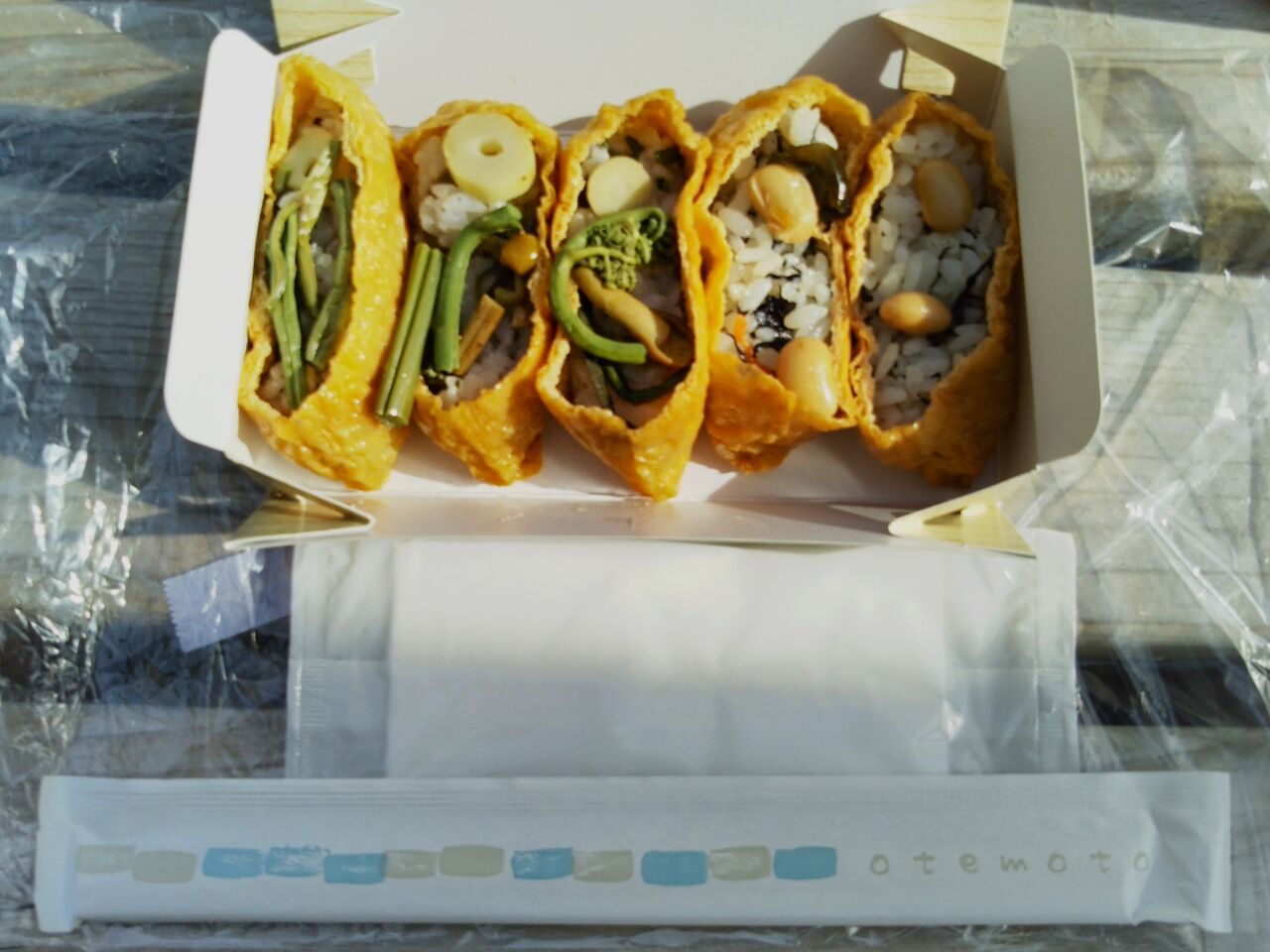 テイクアウトメニューとして『すみれいなり』(山菜のいなり寿司・1個税込170円)2個と『てんぐいなり』(大豆・ひじき・人参のいなり寿司1個税込170円)3個をセットにした『お土産いなり箱(5個)』(税込850円)があります。単品は女性ハイカーに人気の様で、その場で1個だけ食べている人を多く見かけますが、お土産用は掛紙(写真左)が付いて見た目が立派。登山前後のどちらに食べるにもお手頃なサイズ。揚げにしっかりとした甘みが付いており美味しいです。