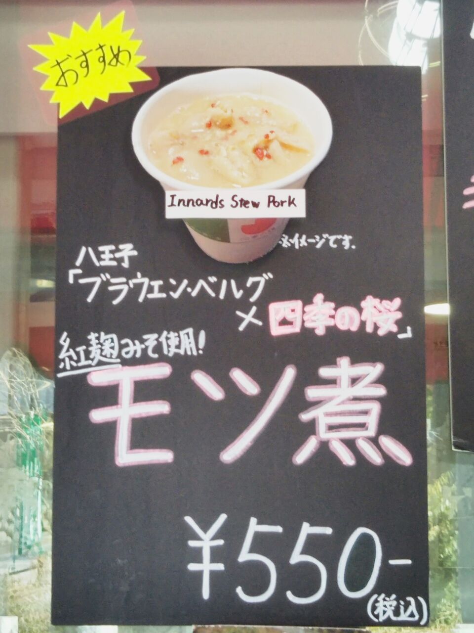 もうひとつのテイクアウトメニューは八王子ブラウエン・ベルグのモツ煮。税込550円。紅麹使用。モツは大き目で食べ応えあり。