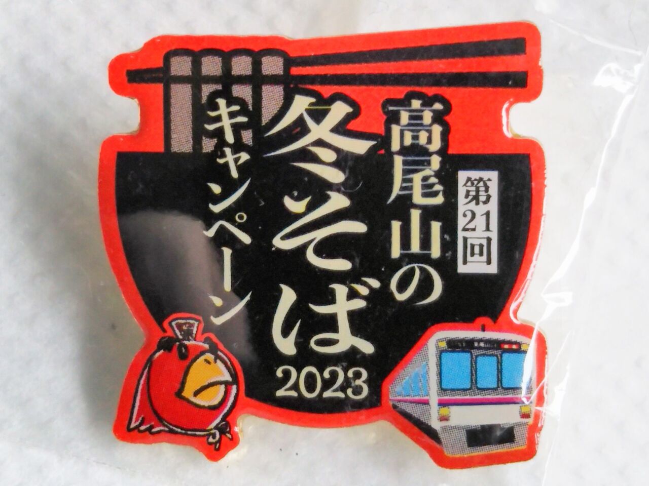 第21回・高尾山の冬そばキャンペーンでは、そば店を2回廻り、500円以上のそば・うどんを食べた者の先着1,700名に写真のピンバッジがプレゼントされます。交換場所は高尾山口観光案内所。デザインは現在運行中の冬そば高尾号に使用される8000系・高尾山トレインではなく7000系。