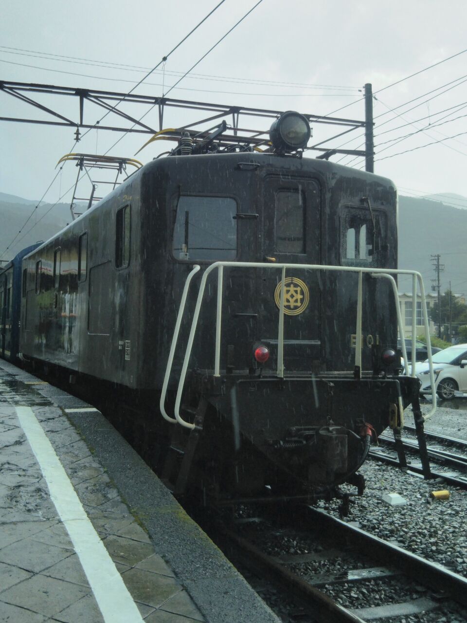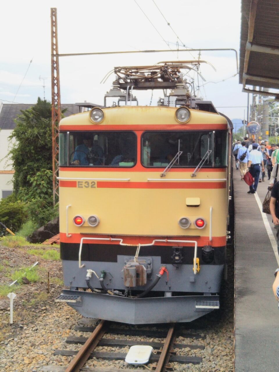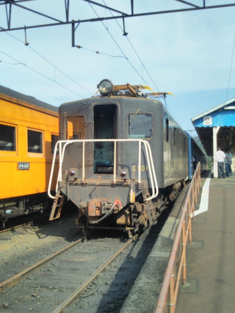 客レ1本目となる新金谷発・家山行の第11列車。新金谷駅改札時点で既に15名ほどの列が出来ていました。金谷発の電車到着前には2号車の通勤・通学利用者優先座席を除き、多くの席が1ボックスあたり1〜4名の客で埋まりました。平日にも関わらず大人気です。写真は接続電車到着前に新金谷駅にて撮影した電気機関車。ヘッドマークの装着はありません。
