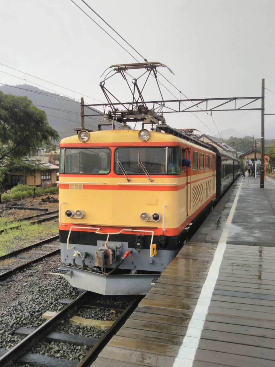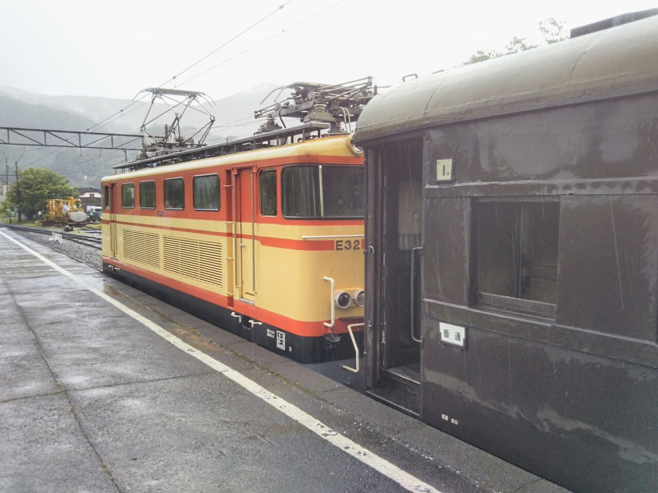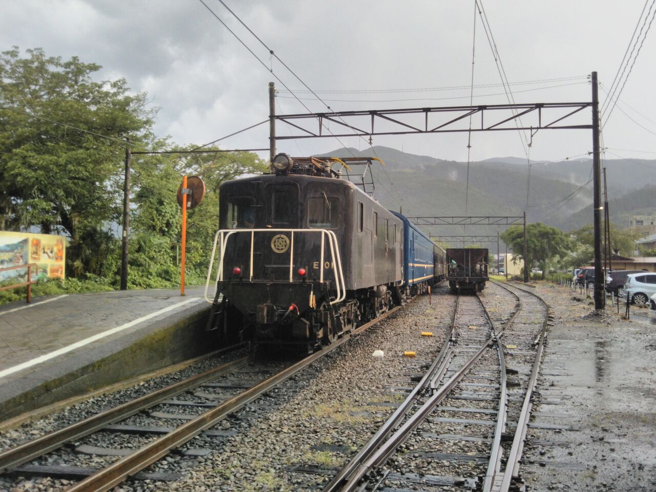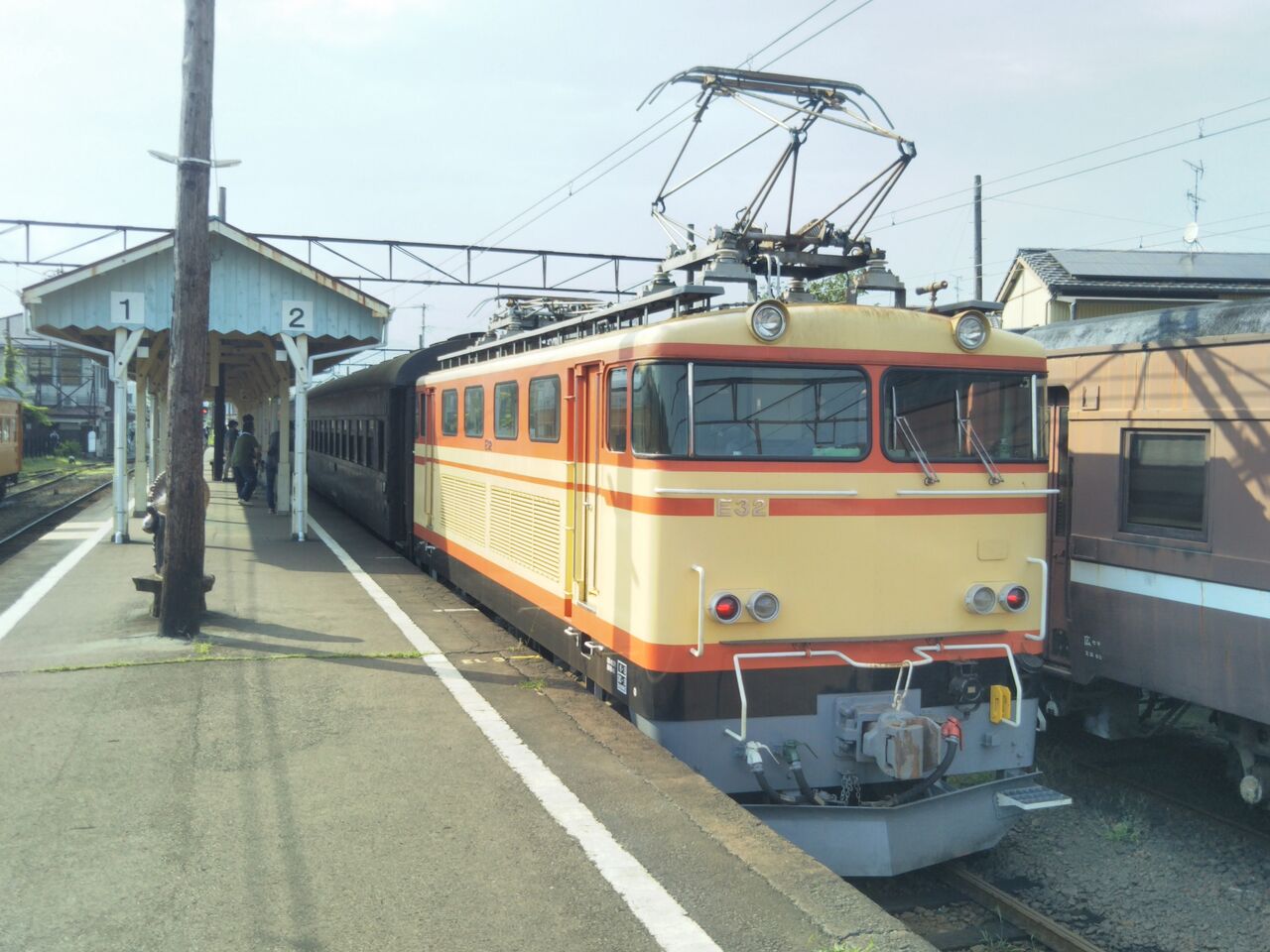 客レ1本目となる新金谷発・家山行の第11列車。新金谷駅改札時点で既に15名ほどの列が出来ていました。金谷発の電車到着前には2号車の通勤・通学利用者優先座席を除き、多くの席が1ボックスあたり1〜4名の客で埋まりました。平日にも関わらず大人気です。写真は接続電車到着前に新金谷駅にて撮影した電気機関車。ヘッドマークの装着はありません。