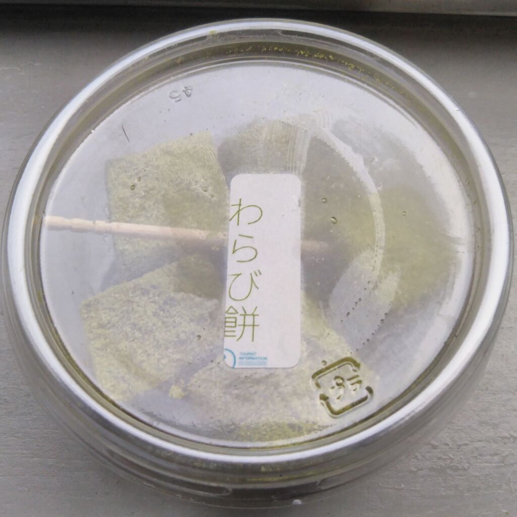 一口サイズの冷たいわらび餅が複数入っており、税込200円。写真左は容器に貼られていた商品シール。写真右は原材料表示。