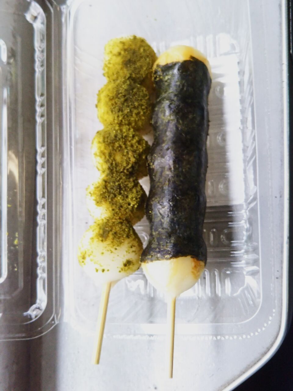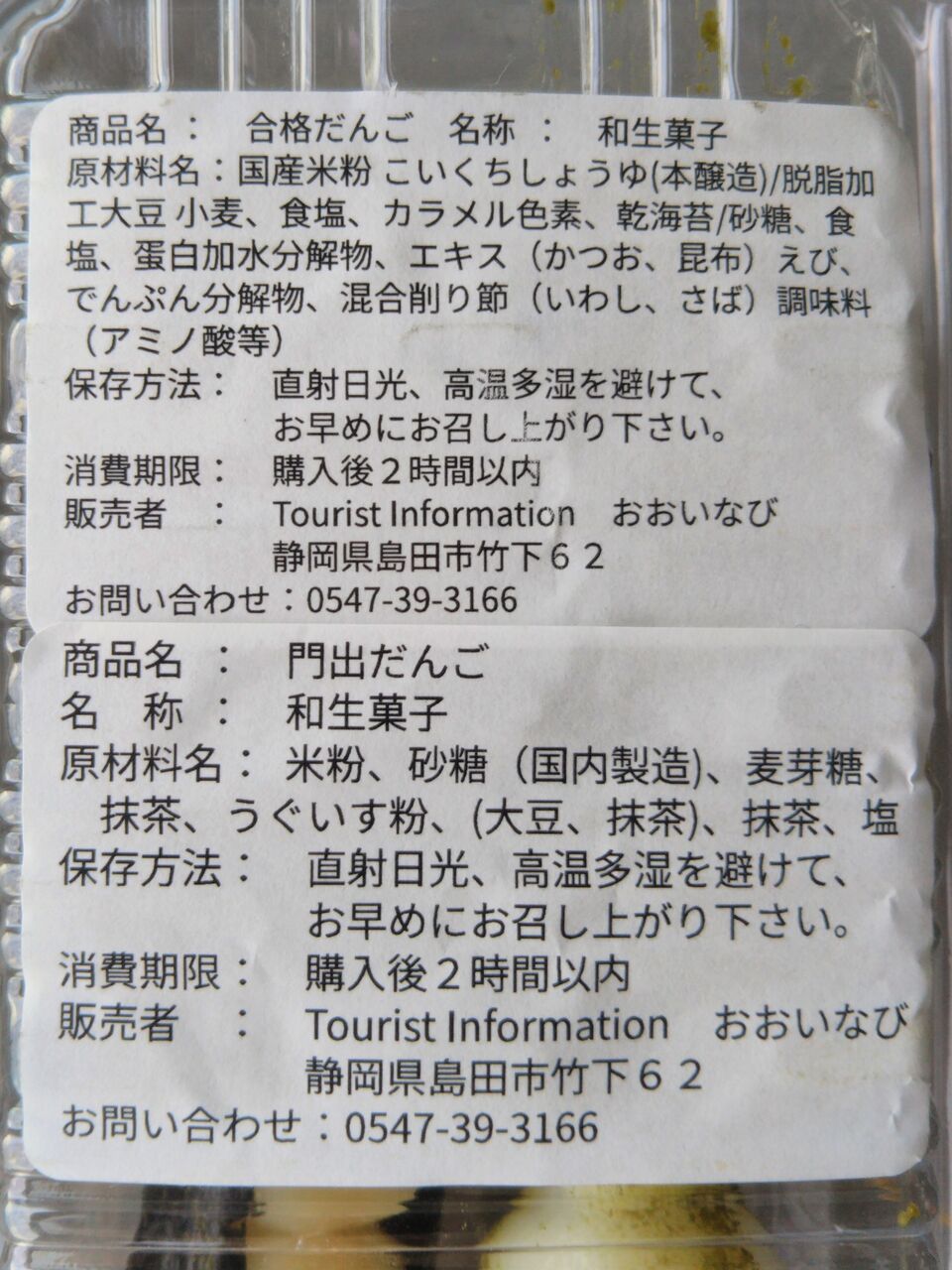 抹茶きな粉といそべ焼き風の2種類入りで税込300円。写真左は容器に貼られていた商品シール。写真右は原材料表示。