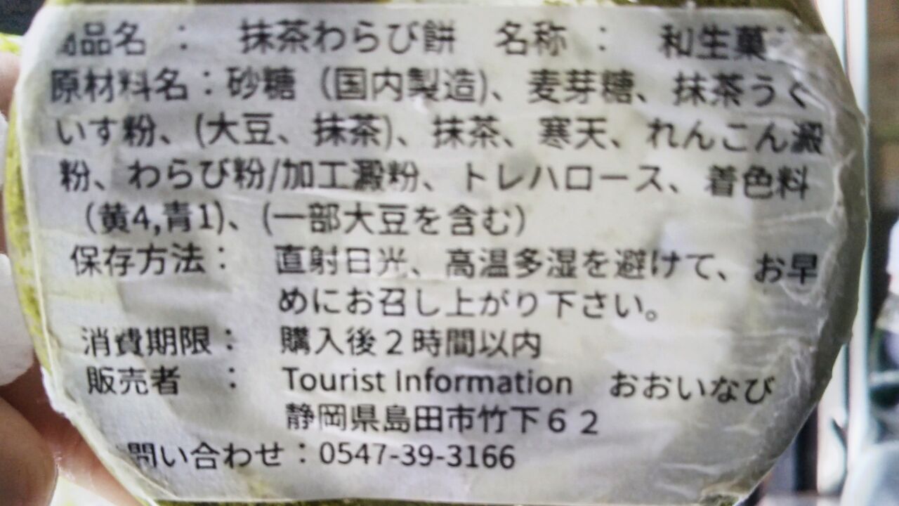 写真左は商品外観。写真右は中身です。大井川鐵道の車内販売が先述の弁当、おつまみセット、チップスターなど、しょっぱい味のものが多いのに対して、おおいなびはスイーツ中心でした。いそべ焼き風だんごはおおいなび取扱商品で唯一のしょっぱい味。《抹茶わらび餅》