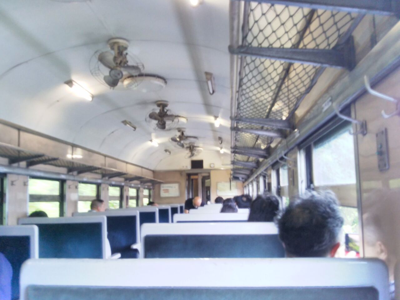 私は3号車(オハフ33 469)に乗車しました。元特急用のスハフ(1号車)と床が木のオハ(2号車)から埋まっていく様でした。写真は第11列車・3号車内と車窓からの景色。