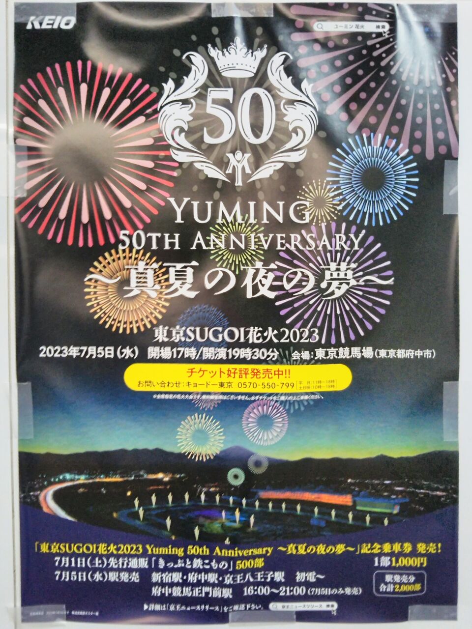 京王線聖蹟桜ヶ丘駅に掲出された花火イベント及び記念乗車券のポスター。《是政橋付近から見た「東京SUGOI花火2023 Yuming 50th Anniversary〜真夏の夜の夢〜」(2023年7月5日撮影)》