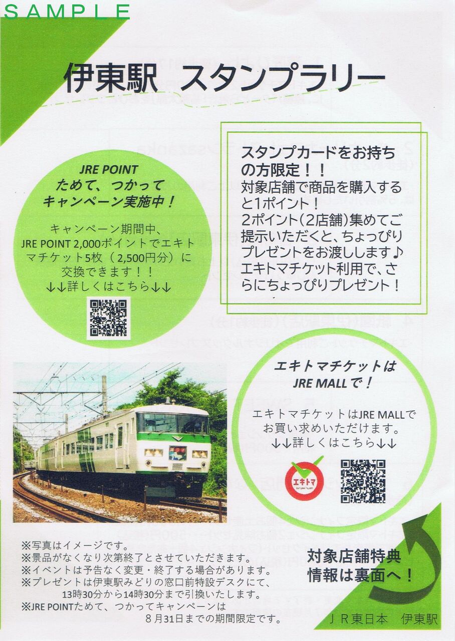 伊東行車内で配布されたJR伊東駅スタンプラリーのカードと対象店舗の案内です。スタンプラリーの内容ですが、伊東駅構内又は周辺の対象店舗・2店舗での買い物。更にエキトマチケット(JR東日本の電子チケットサービス)の利用(先述の対象店舗にてエキトマチケット利用の場合、1回の買い物でスタンプ2個となる)で、スタンプを計3個押すと『サフィール踊り子クリアファイル(A4)』『E257系ジップロック』がプレゼントされます。