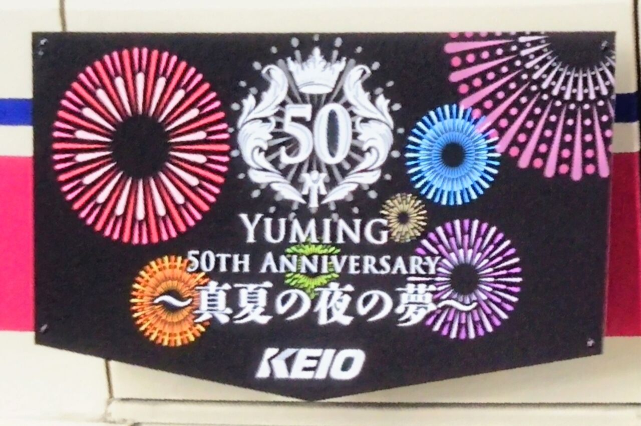 京王電鉄は、2023年(令和5年)7月5日、東京競馬場にて開催された花火イベント『東京SUGOI花火2023「Yuming 50th Anniversary 〜真夏の夜の夢〜」』を記念して、記念乗車券の発売、2023年(令和5年)6月13日〜7月5日に8000系1編成を記念ヘッドマーク付き列車として運行しました。花火イベントは松任谷由実さんのデビュー50周年を記念して開催されており、会場には松任谷由実さんがサプライズで登場されたようです。
