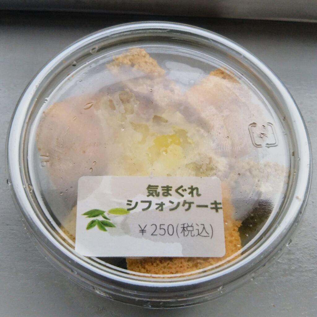 先述のわらび餅同様に一口サイズにカットられたシフォンケーキで、税込250円。写真は容器に貼られていた商品シールです。