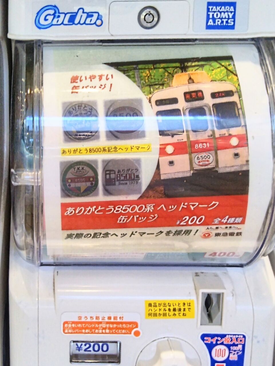 長津田駅に設置された当該商品のカプセルトイ販売機です。販売機は全部で10台設置されており、8500系関連以外に東急新横浜線開業記念、のるるん等のカプセルトイがあります。《ありがとう8500系ヘッドマーク缶バッジ(2023年8月17日収集)》