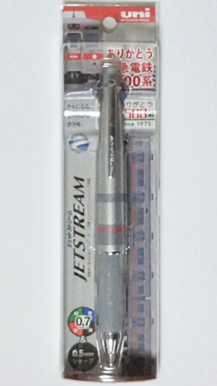 税込1,980円。8500系・8634Fのコルゲート部分をデザインした4色ボールペン+シャープペンシル。発売元は東急株式会社。企画は株式会社立誠社。製造は三菱鉛筆。東急電鉄株式会社商品化許諾済。台紙付き(ありがとう8500系ロゴ入り)。