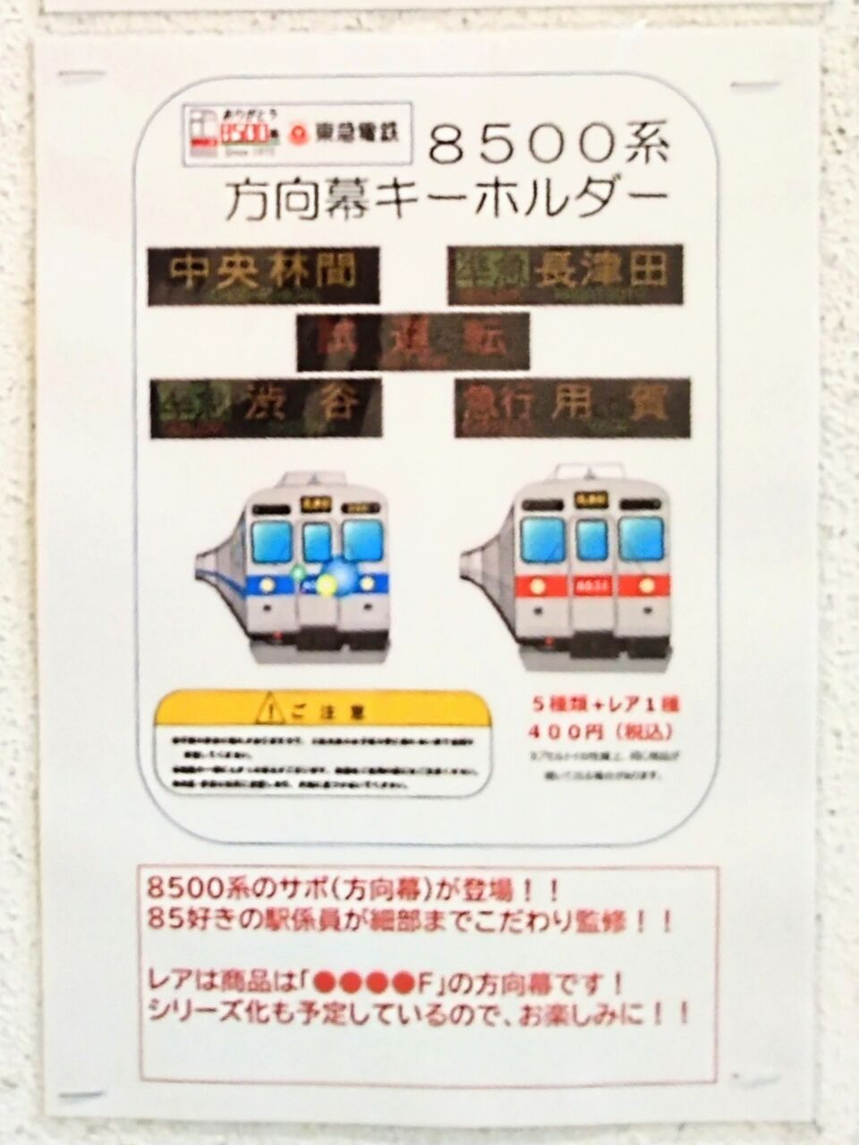 また、引退前後には8500系デザインのカプセルトイが発売されており、引退後の2023年8月17日時点で、長津田駅改札外・券売機横のカプセルトイ販売機にて缶バッジ、キーホルダーが販売されています。