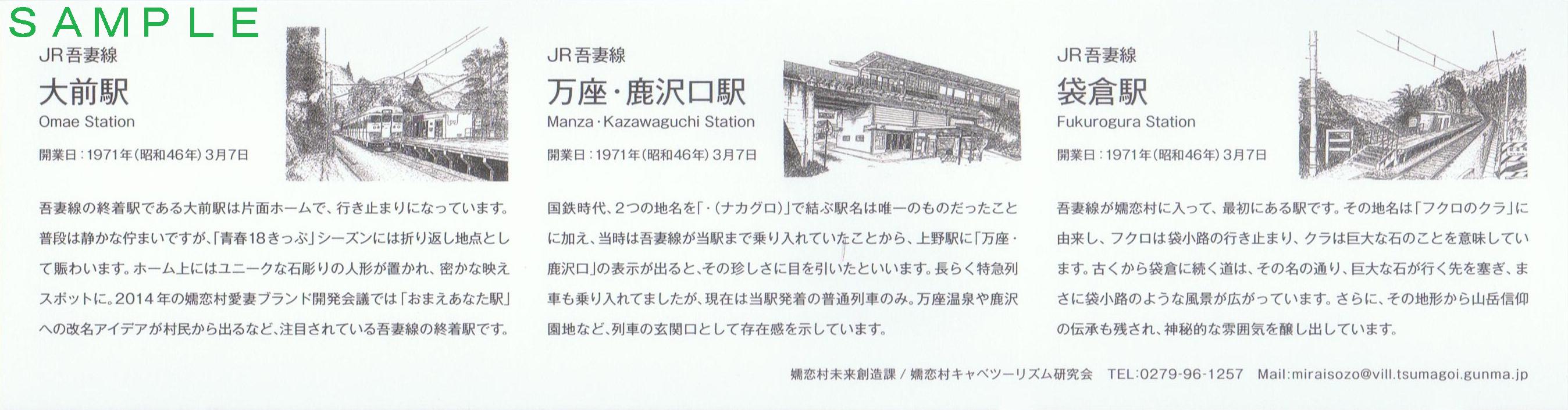 嬬恋村観光協会にて草軽電気鉄道の復刻乗車券等の鉄道グッズ購入時に付いていたシールの表面と裏面です。嬬恋村内にある吾妻線の駅名標デザインで、裏面に各駅の駅舎イラスト、概要が記されています。