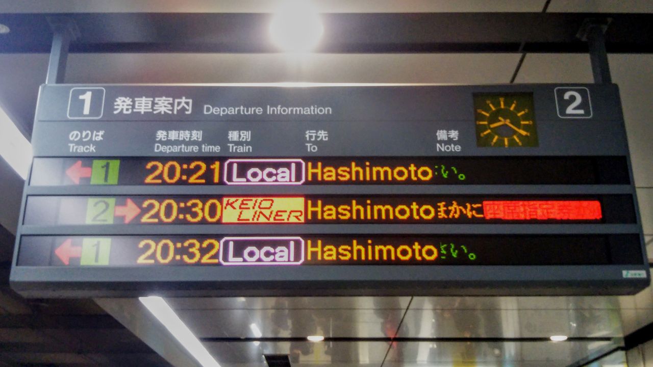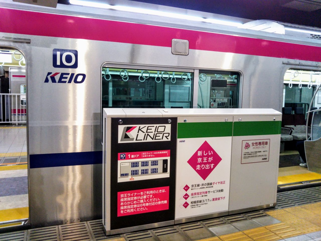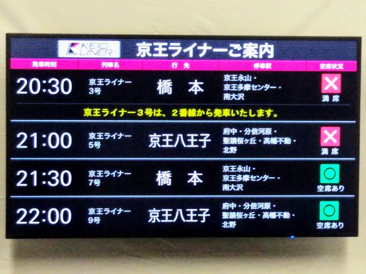 ¡¡¿·½É±ØÀ¾¸ý¤ÎJR¡Áµþ²¦Ï¢ÍíÄÌÏ©¤ÎJRÀþ¦¤Ë¿·¤¿¤Ëµþ²¦¥é¥¤¥Ê¡¼¤ÈÁ´Îó¼Ö¤Î°ÆÆâɽ¼¨¤¬2¤ÄÀßÃÖ¤µ¤ì¤Æ¤¤¤Þ¤·¤¿¡£¼Ì¿¿¤Ïµþ²¦¥é¥¤¥Ê¡¼ÍѤÎɽ¼¨¡£