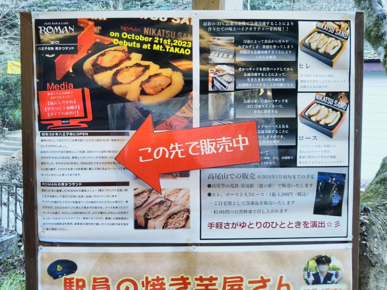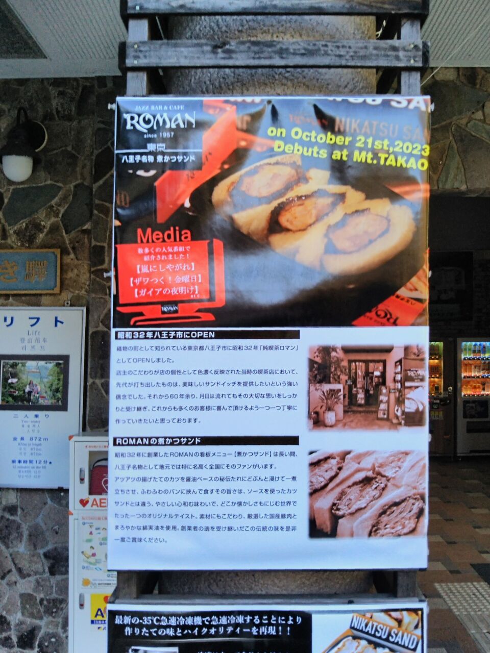 Mt.FUJI号、ダイヤモンド富士号の運行期間より長い期間(2023年10月21日〜2024年1月初旬予定)の限定となりますが、高尾山ケーブルカー清滝駅舎内・改札裏の売店・やまゆりにて『JAZZ BAR&CAFE ROMAN』の『八王子名物 煮かつサンド』(2種類・各税込1,300円)が販売されています。写真は清滝駅舎正面に掲示された煮かつサンドのポスター2種類。随分と目立つところに掲示しています。