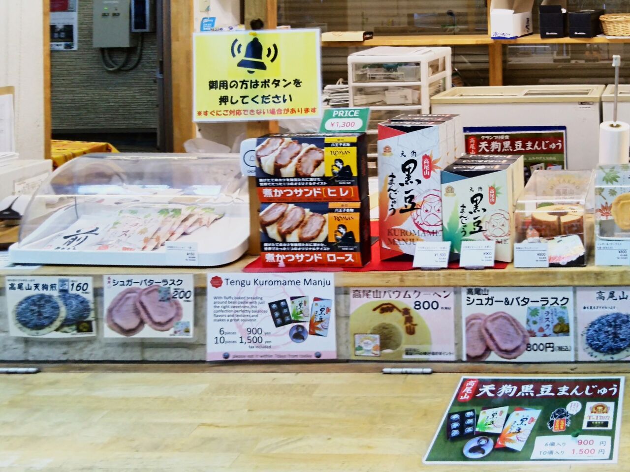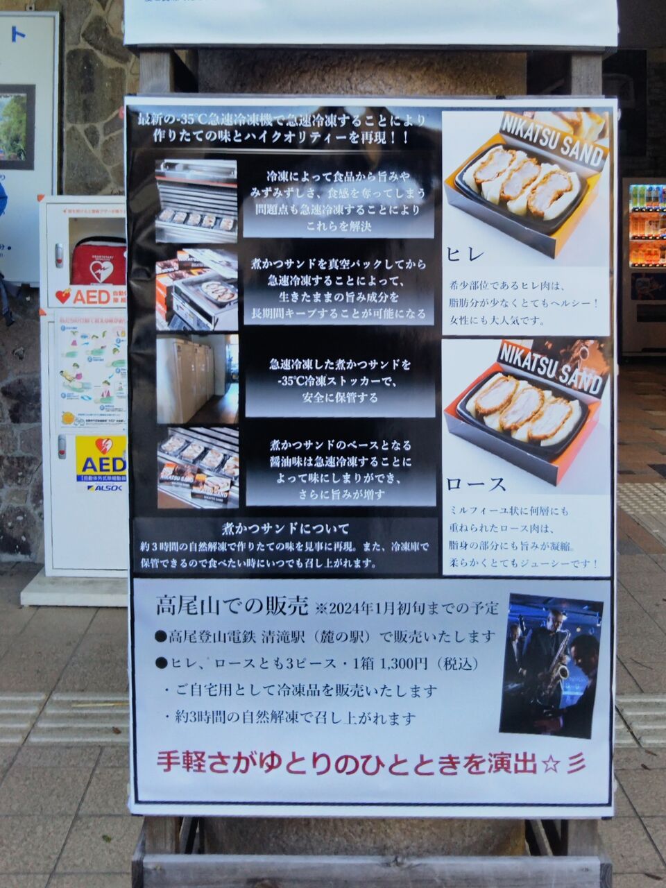 更に、清滝駅のケーブルカー降車口にもポスターを掲示。その数メートル先に清滝駅売店・やまゆりがありますが、陳列された商品の中心に煮かつサンドのパッケージがありました。さて、本商品ですが冷凍されているため、通常の駅弁とは形態が異なりますが、既に同商品は中央自動車道・石川パーキングエリア売店、JR東日本八王子駅『やまたまや』にて販売実績があり、電子レンジでの温め以外に(気候にもよりますが)3時間の自然解凍で食べられます。飲食店の無い休憩所で食事をするハイカーの方にも向いている商品です。高尾登山電鉄としては『お土産品』という位置づけのようですが、広義の駅弁に含めてよいものと思い、当ブログでは駅弁として扱います。以前から高尾山口駅周辺にて駅弁があってもよいと思っていましたが、既に終売の高尾山口駅売店(セブンイレブン化前)にて販売されていた掛紙付きおにぎり2個セット以来。既存商品であれ、久しぶりにそれらしいものが登場しました。