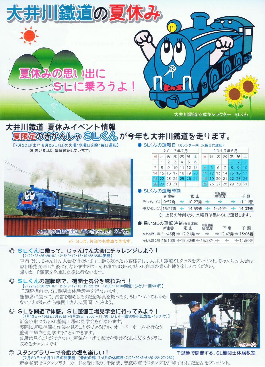 A4サイズ・両面印刷のリーフレット。当時運行されていたSL急行列車『SLくん』と『かわね路号』の時刻表、SLくん関連のイベント等について記載。【関連記事】