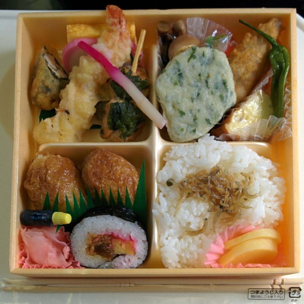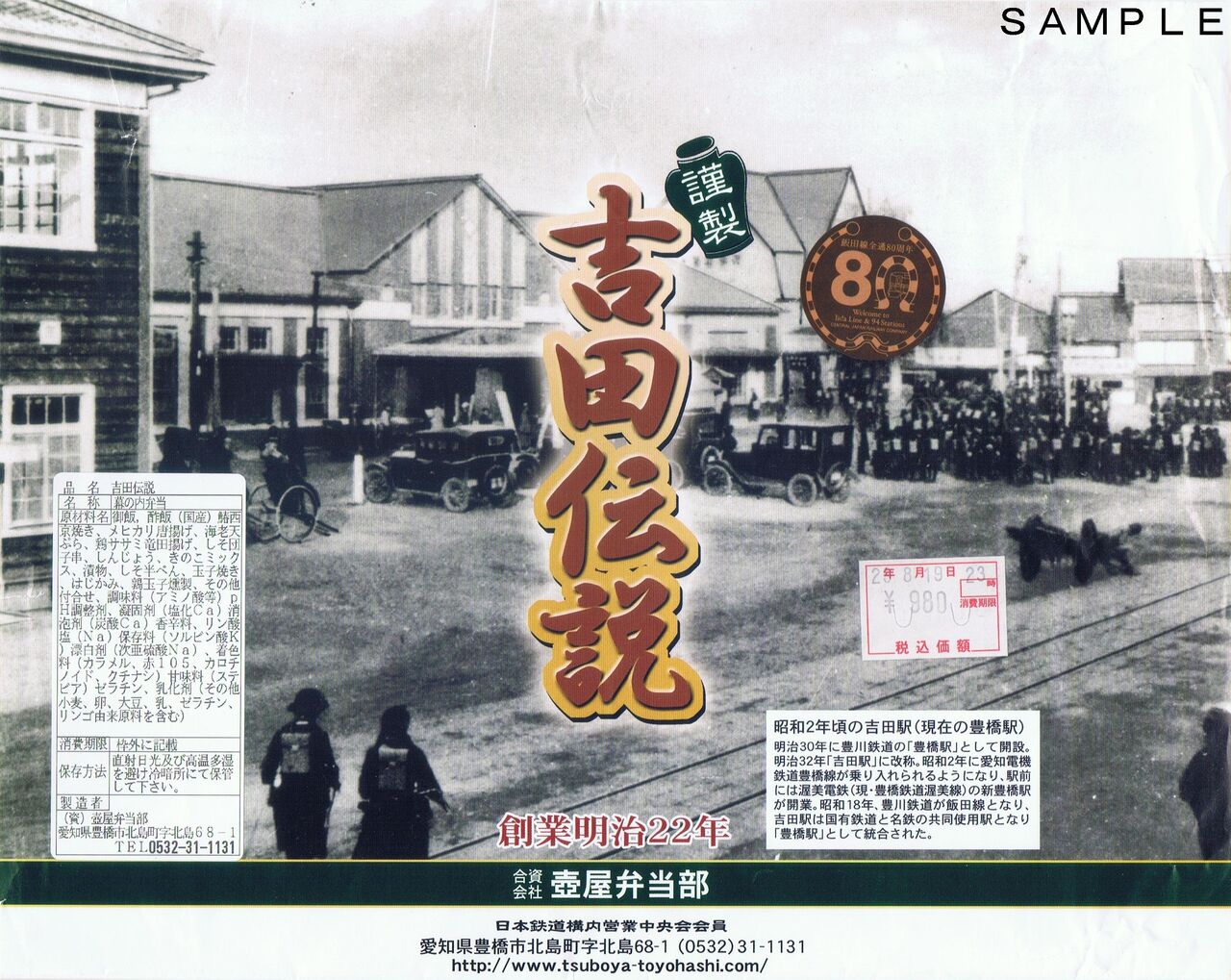 飯田線80周年記念弁当。収集当時に発売されたもので、当時の価格は税込980円。掛紙(写真左)のデザインは昔の駅舎。飯田線80周年ロゴの部分はシールが貼り付けられています。写真右は中身。豊橋名物の稲荷寿司などをコンパクトにまとめた弁当です。なお、2024年(令和6年)1月時点で調製元ホームページの『商品のご案内』に掲載されており、価格が税込1,060円に変わっていますがレギュラーメニュー化されたようです。――――――――――――――――――――――――――――――――――――――