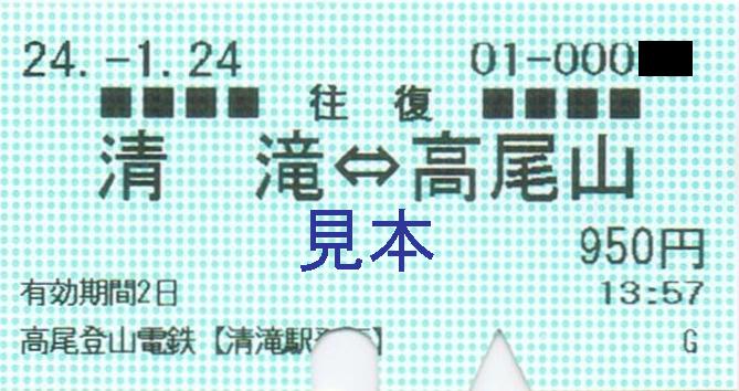 清滝駅券売機で購入した往復乗車券。実際に使用。鋏は下が清滝駅、上が高尾山駅のものです。《券売機券 清滝駅(2024年1月24日発行)》