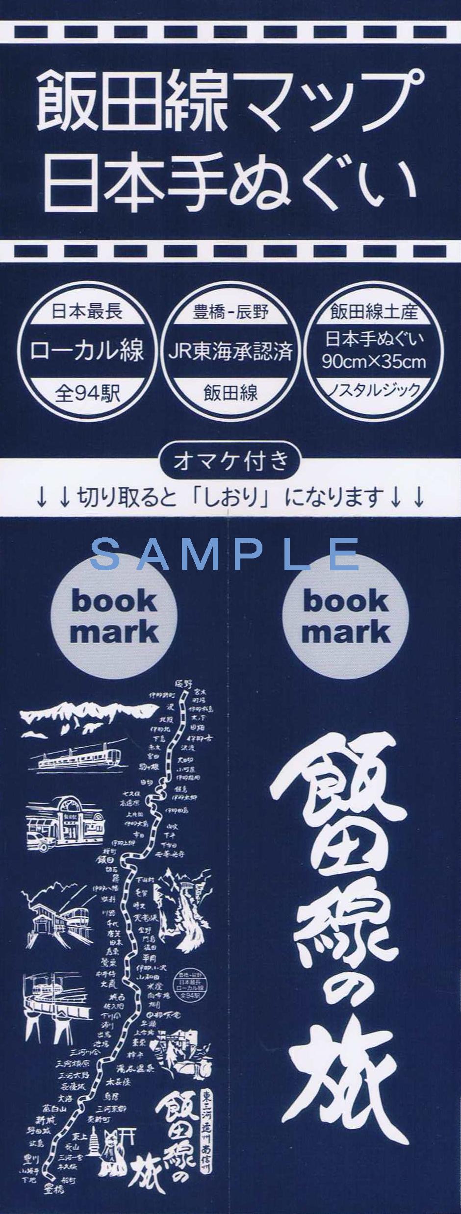 飯田線80周年秘境駅号車内で販売された飯田線80周年記念グッズの手ぬぐいです。写真はその台紙。台紙左下に描かれているマップが手ぬぐいのデザインです。税込1,080円。国鉄時代に使用されていた旧型国電をイメージして青白のデザインにしたそうですが、製作後に描かれている車両が現在の車両であることを指摘されたそうな。