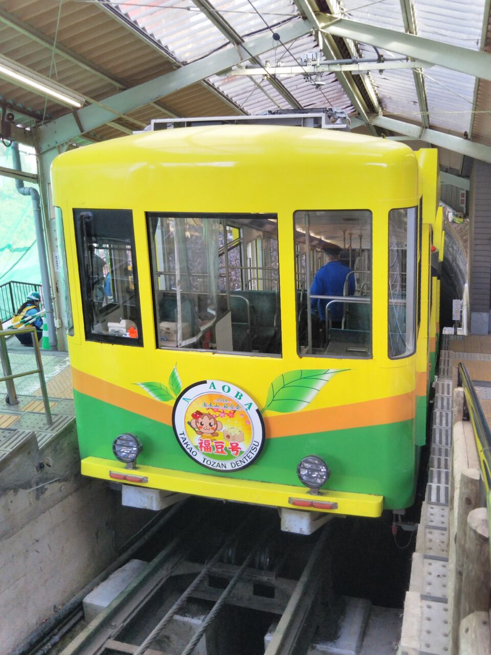 高尾山駅にて撮影した福豆号です。平日にしては外国人観光客で賑わい、利用者がいました。