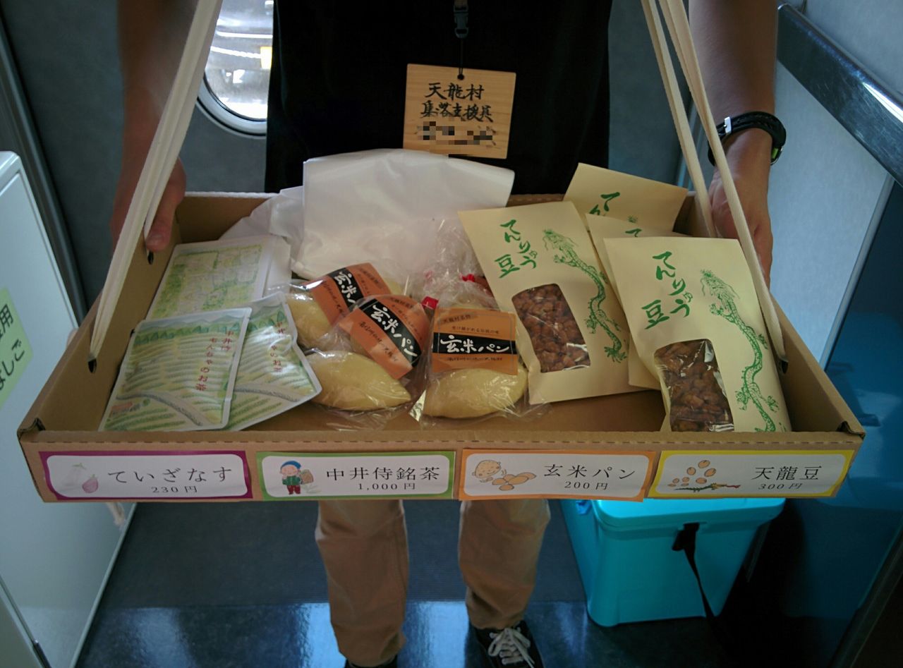 天龍村集落支援員の方による車内販売品。昔ながらの立ち売りスタイルです。《平岡駅の特産品販売 軟骨唐揚げ&天龍村のふるまい 栃のそば》