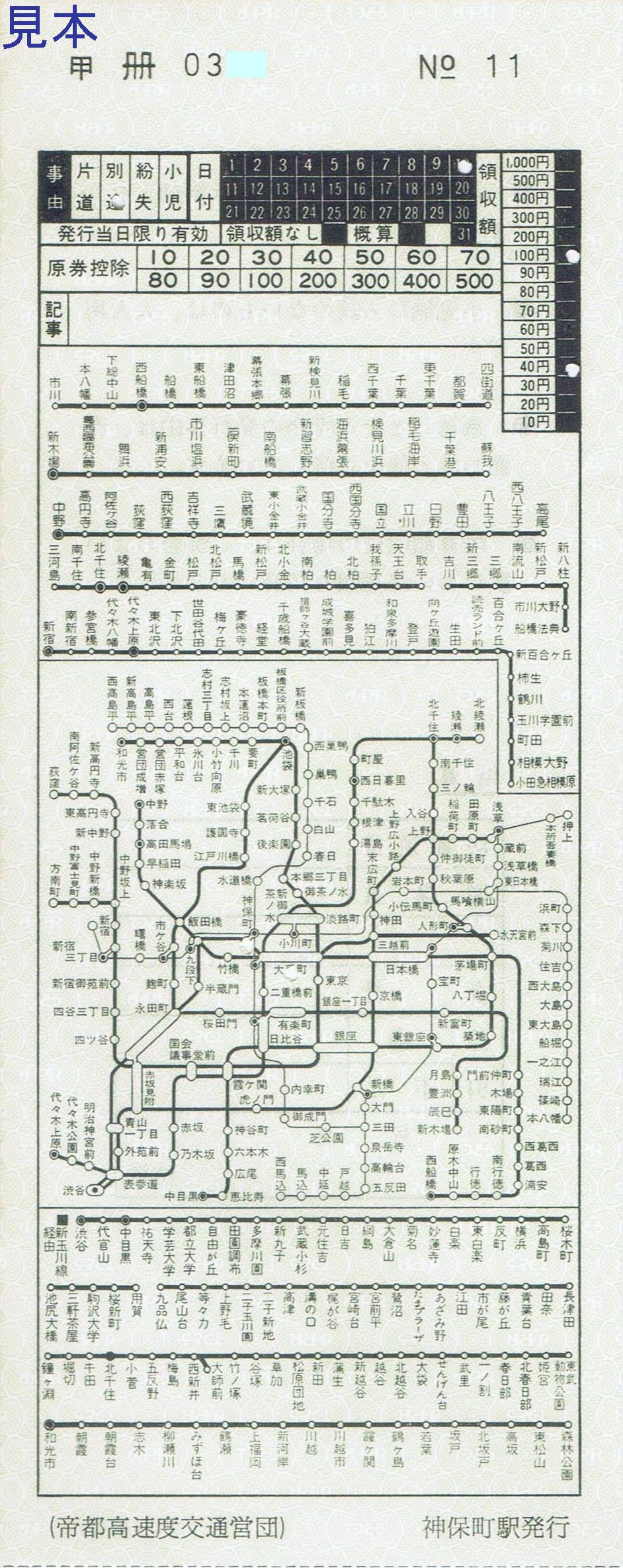 《神保町駅発行 地図式・特別補充券(平成3年8月10日収集)》