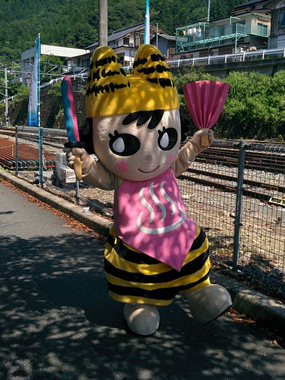 ホーム上で、ご当地キャラクターや地元の方々がお見送り。