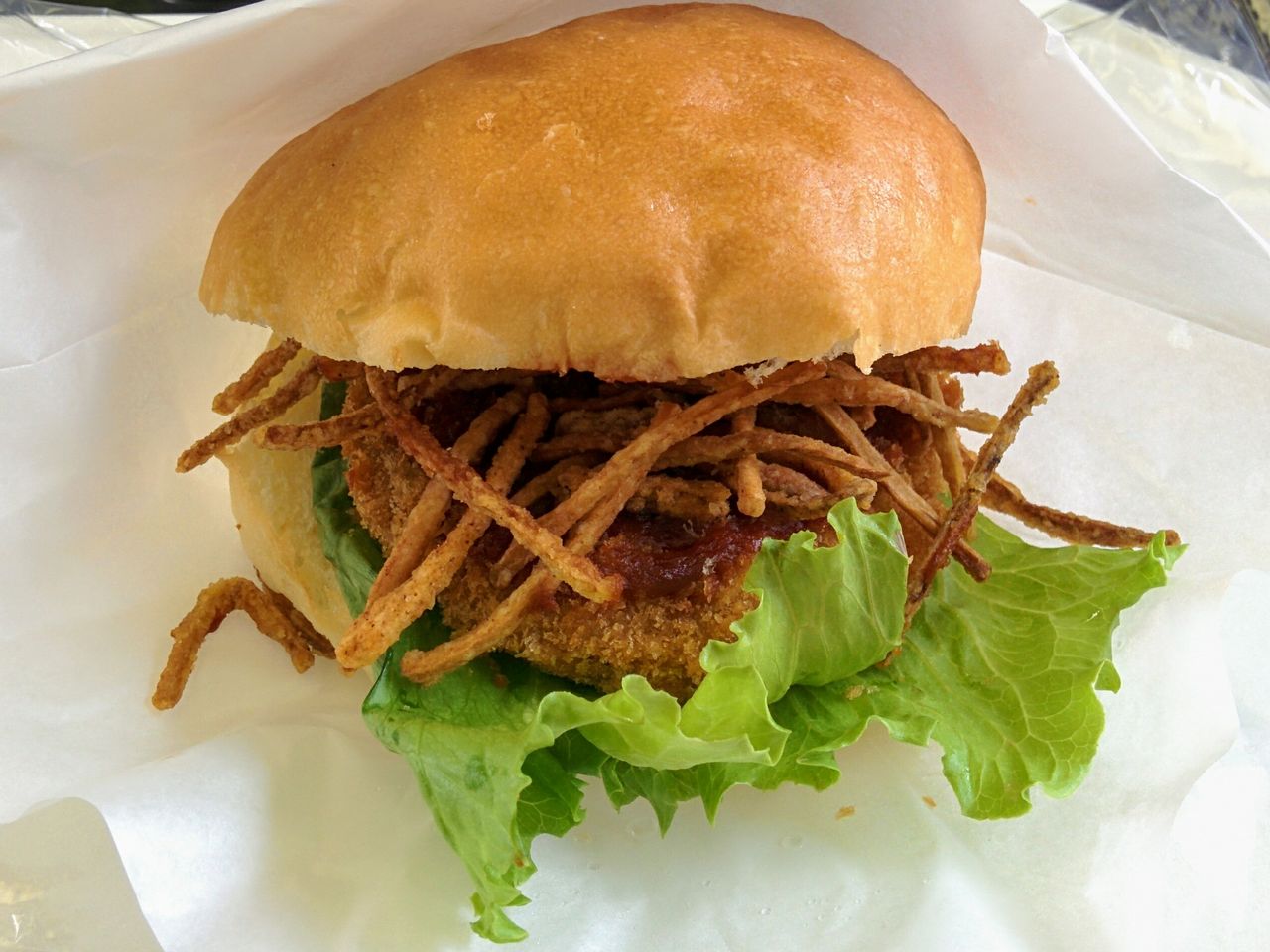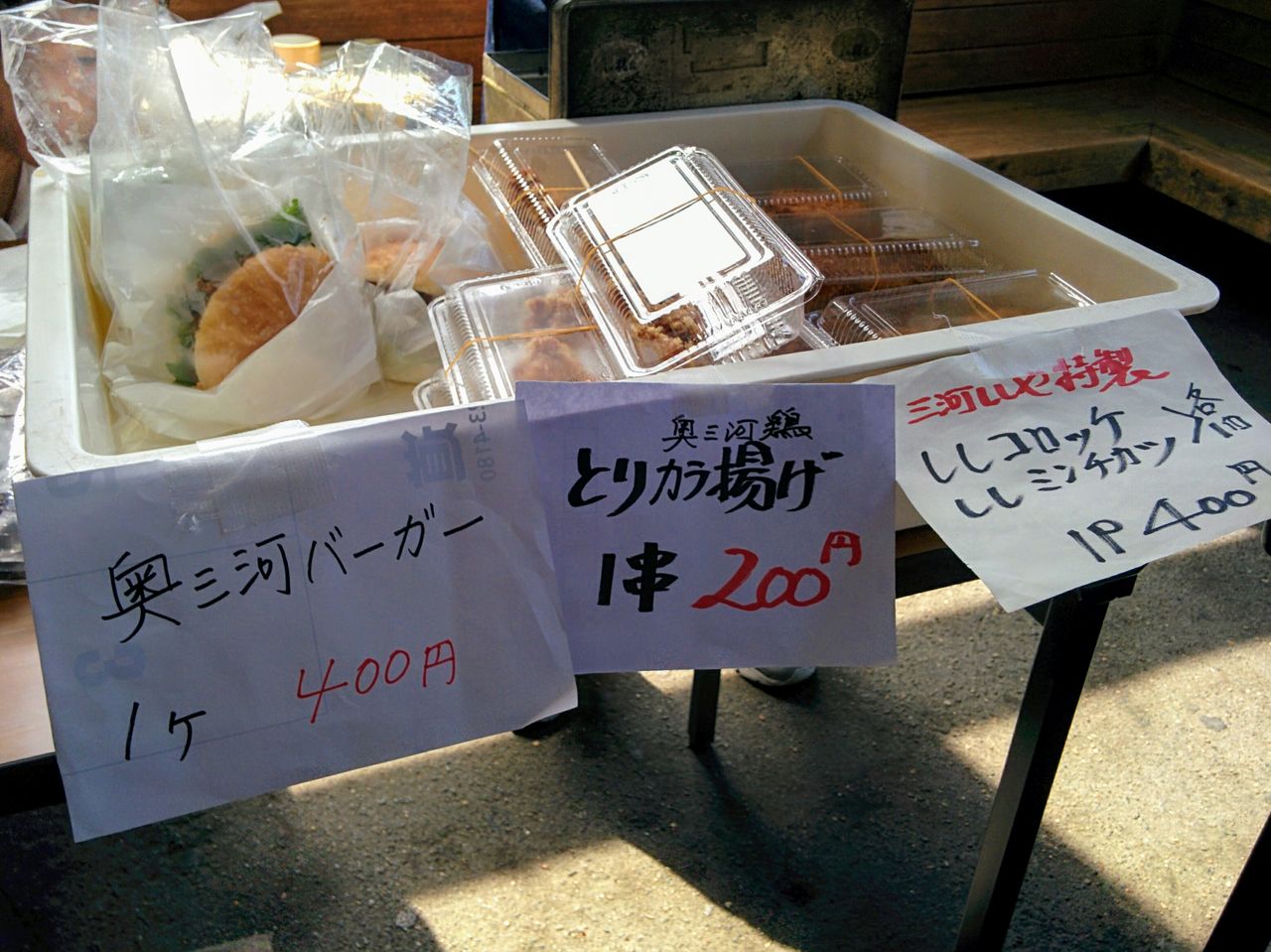 新城駅舎内では地元特産品の販売を実施。三河猪家(ししや)が販売した、ししミンチカツを挟んだ『奥三河バーガー』(税込400円)。スティック状に揚げられたゴボウが沢山トッピングされています。写真右は新城駅特産品販売コーナーのうち、三河猪家の販売品。からあげが大人気でした。